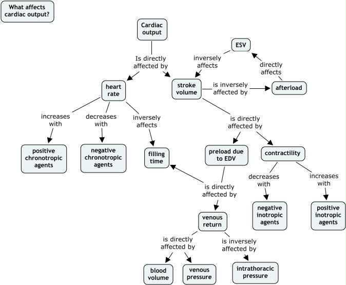 This Concept Map, created with IHMC CmapTools, has information related to: BryanKraftTutorial, afterload directly affects ESV, stroke volume is directly affected by preload due to EDV, preload due to EDV is directly affected by filling time, ESV inversely affects stroke volume, venous return is directly affected by blood volume, Cardiac output Is directly affected by heart rate, venous return is directly affected by venous pressure, contractility increases with positive inotropic agents, stroke volume is inversely affected by afterload, heart rate decreases with negative chronotropic agents, stroke volume is directly affected by contractility, heart rate increases with positive chronotropic agents, preload due to EDV is directly affected by venous return, heart rate inversely affects filling time, contractility decreases with negative inotropic agents, venous return is inversely affected by intrathoracic pressure, Cardiac output Is directly affected by stroke volume