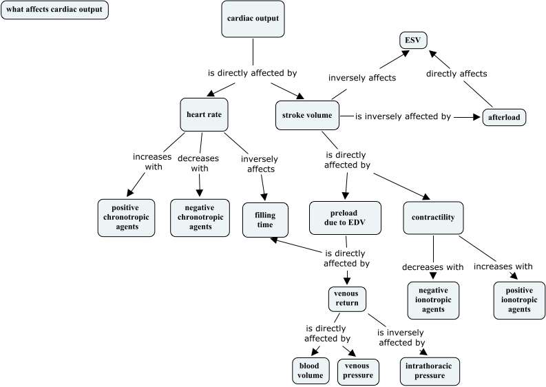 This Concept Map, created with IHMC CmapTools, has information related to: ChristoSwanTutorial, preload due to EDV is directly affected by venous return, cardiac output is directly affected by stroke volume, preload due to EDV is directly affected by filling time, stroke volume is inversely affected by afterload, cardiac output is directly affected by heart rate, venous return is directly affected by venous pressure, stroke volume inversely affects ESV, heart rate inversely affects filling time, afterload directly affects ESV, heart rate decreases with negative chronotropic agents, stroke volume is directly affected by contractility, contractility increases with positive ionotropic agents, stroke volume is directly affected by preload due to EDV, heart rate increases with positive chronotropic agents, venous return is inversely affected by intrathoracic pressure, venous return is directly affected by blood volume, contractility decreases with negative ionotropic agents