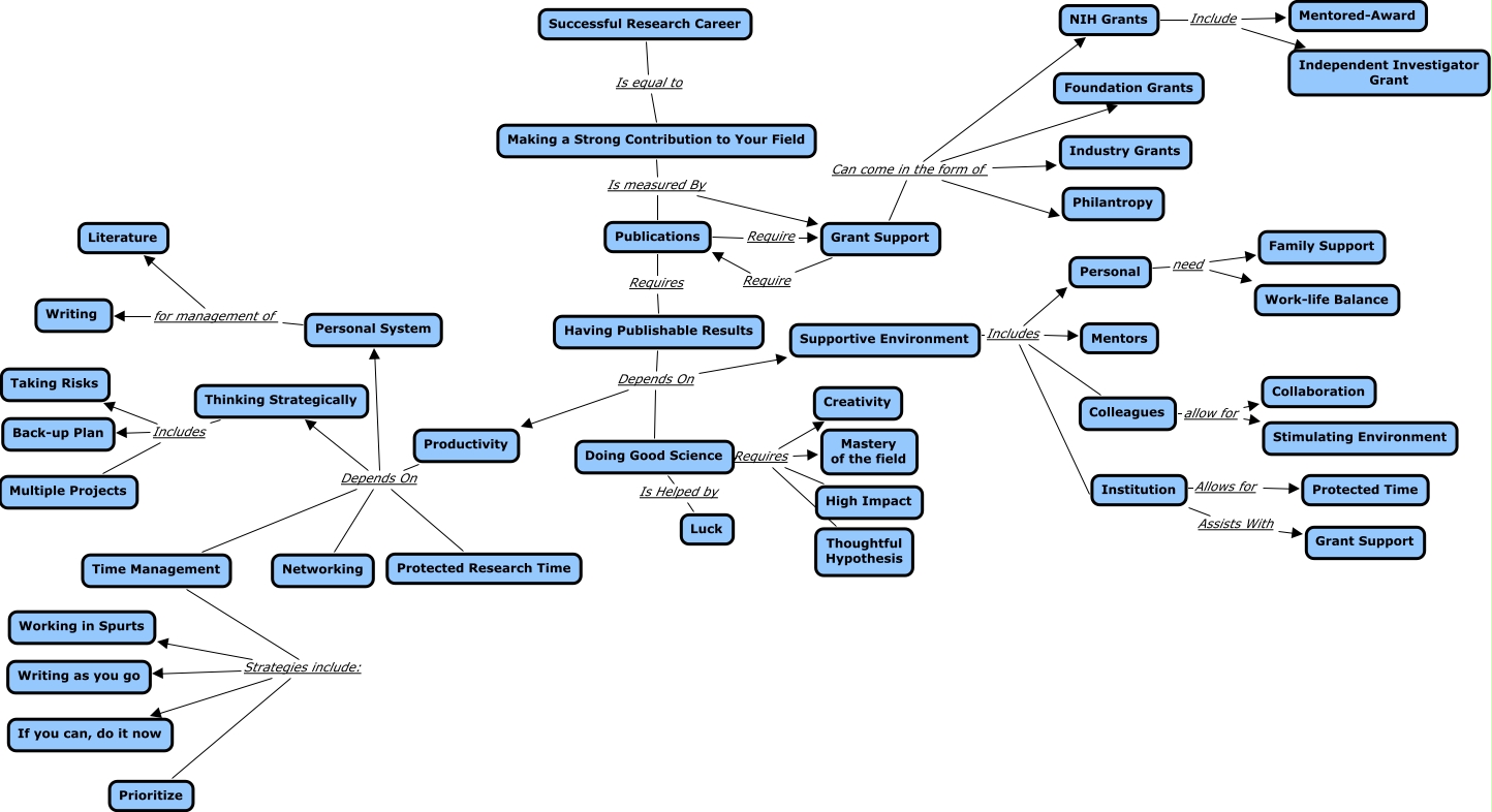 This Concept Map, created with IHMC CmapTools, has information related to: DariaBabushok-Research Career 2, Doing Good Science Requires Thoughtful Hypothesis, Supportive Environment Includes Institution, Institution Assists With Grant Support, NIH Grants Include Independent Investigator Grant, Time Management Strategies include: Prioritize, NIH Grants Include Mentored-Award, Doing Good Science Requires Mastery of the field, Grant Support Require Publications, Personal System for management of Writing, Time Management Strategies include: Working in Spurts, Personal System for management of Literature, Supportive Environment Includes Colleagues, Supportive Environment Includes Mentors, Time Management Strategies include: If you can, do it now, Productivity Depends On Personal System, Personal need Family Support, Grant Support Can come in the form of Industry Grants, Doing Good Science Requires High Impact, Thinking Strategically Includes Back-up Plan, Productivity Depends On Networking