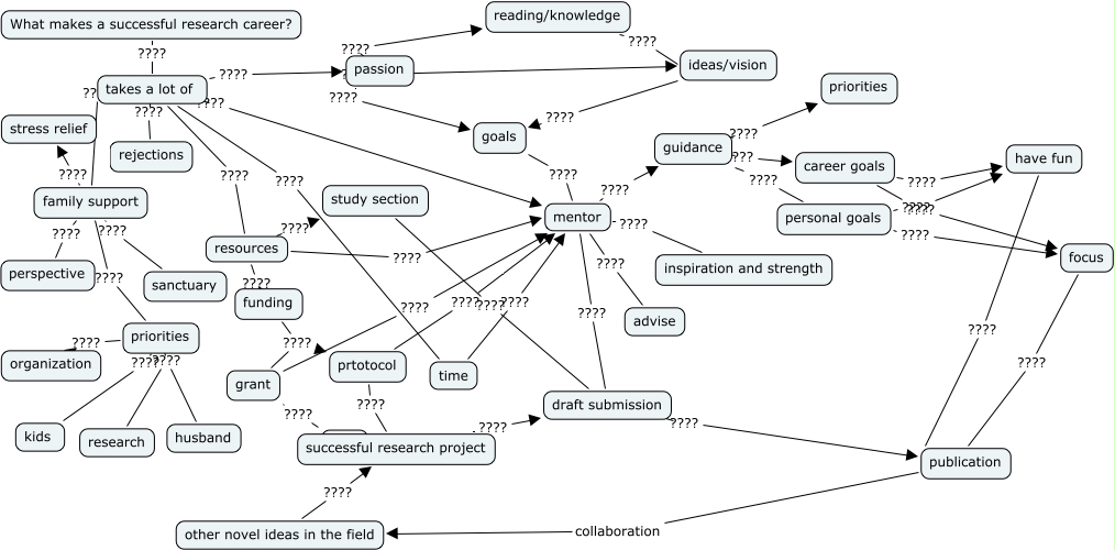 This Concept Map, created with IHMC CmapTools, has information related to: SaliniNaiduMap2, mentor ???? advise, reading/knowledge ???? ideas/vision, takes a lot of ???? resources, takes a lot of ???? family support, time ???? mentor, mentor ???? guidance, publication collaboration other novel ideas in the field, What makes a successful research career? ???? takes a lot of, family support ???? priorities, guidance ???? priorities, focus ???? publication, study section ???? draft submission, funding ???? grant, guidance ???? career goals, grant ???? mentor, takes a lot of ???? rejections, mentor ???? draft submission, family support ???? stress relief, resources ???? funding, draft submission ???? publication