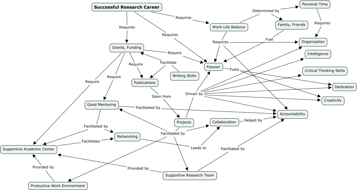 This Concept Map, created with IHMC CmapTools, has information related to: RMukerjee Cmap2, Passion Fuels Creativity, Projects Driven by Accountability, Grants, Funding Require Publications, Grants, Funding Require Passion, Grants, Funding Require Supportive Academic Center, Publications Stem from Projects, Collaboration Helped by Accountability, Projects Driven by Passion, Projects Facilitated by Supportive Research Team, Passion Fuels Dedication, Projects Facilitated by Productive Work Environment, Projects Facilitated by Collaboration, Projects Driven by Intelligence, Supportive Research Team Provided by Supportive Academic Center, Grants, Funding Require Good Mentoring, Successful Research Career Requires Work-Life Balance, Work-Life Balance Determined by Family, Friends, Projects Driven by Critical Thinking Skills, Projects Driven by Creativity, Writing Skills Facilitate Grants, Funding