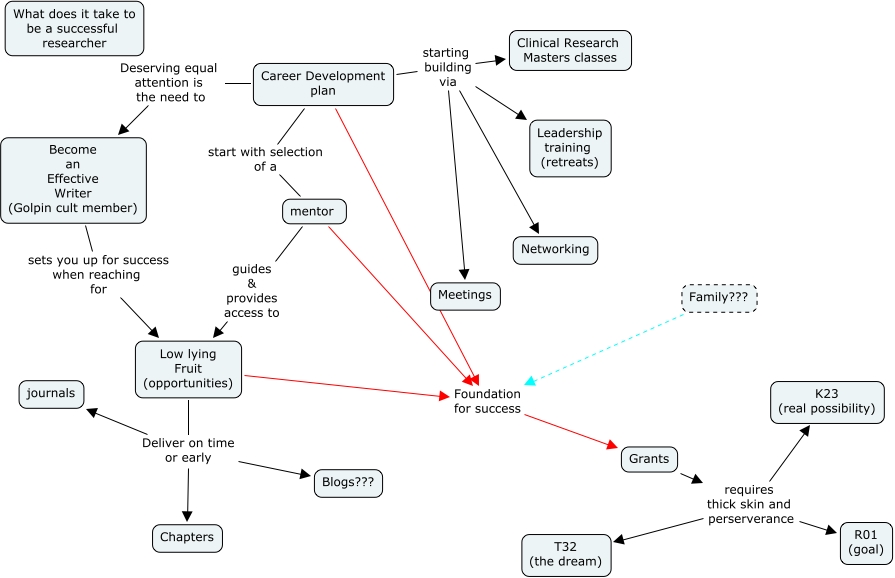 This Concept Map, created with IHMC CmapTools, has information related to: What makes a successful research career (part 2), mentor guides & provides access to Low lying Fruit (opportunities), Low lying Fruit (opportunities) Deliver on time or early Blogs???, Career Development plan Deserving equal attention is the need to Become an Effective Writer (Golpin cult member), Career Development plan starting building via Meetings, Family??? Foundation for success Grants, mentor Foundation for success Grants, Grants requires thick skin and perserverance T32 (the dream), Low lying Fruit (opportunities) Deliver on time or early journals, Low lying Fruit (opportunities) Deliver on time or early Chapters, Career Development plan Foundation for success Grants, Career Development plan starting building via Networking, Grants requires thick skin and perserverance K23 (real possibility), Low lying Fruit (opportunities) Foundation for success Grants, Grants requires thick skin and perserverance R01 (goal), Career Development plan start with selection of a mentor, Career Development plan starting building via Clinical Research Masters classes, Career Development plan starting building via Leadership training (retreats), Become an Effective Writer (Golpin cult member) sets you up for success when reaching for Low lying Fruit (opportunities)
