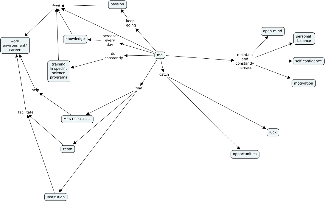 This Concept Map, created with IHMC CmapTools, has information related to: Map 2 Sarah Abbes, me keep going passion, me catch opportunities, MENTOR++++ help work environment/ career, me catch luck, me find MENTOR++++, me maintain and constantly increase self confidence, me maintain and constantly increase motivation, me find institution, training in specific science programs feed work environment/ career, passion feed work environment/ career, me feed work environment/ career, me find team, me increases every day knowledge, institution facilitate work environment/ career, me do constantly training in specific science programs, team facilitate work environment/ career, me maintain and constantly increase personal balance, knowledge feed work environment/ career, me maintain and constantly increase open mind