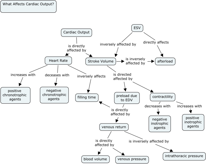 This Concept Map, created with IHMC CmapTools, has information related to: Cardiac Output Cmap, Cardiac Output is directly affected by Stroke Volume, Cardiac Output is directly affected by Heart Rate, venous return is directly affected by blood volume, ESV inversely affected by Stroke Volume, Heart Rate increases with positive chronotrophic agents, venous return is directly affected by venous pressure, preload due to EDV is directly affected by venous return, ESV directly affects afterload, venous return is inversely affected by intrathoracic pressure, Stroke Volume is directed affected by preload due to EDV, Stroke Volume is directed affected by contractility, Heart Rate deceases with negative chronotrophic agents, preload due to EDV is directly affected by filling time, Heart Rate inversely affects filling time, contractility decreases with negative inotrophic agents, Stroke Volume is inversely affected by afterload, contractility increases with positive inotrophic agents