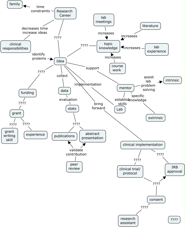 This Concept Map, created with IHMC CmapTools, has information related to: Stephanie Fritch Lilla, clinical implementation ???? IRB approval, data evaluation stats, clinical trial/ protocol ???? consent, peer review validate contribution abstract presentation, Idea support mentor, mentor specific knowledge extrinsic, peer review validate contribution publications, consent ???? research assistant, clinical implementation ???? clinical trial/ protocol, clinical trial/ protocol ???? IRB approval, Idea ???? funding, course work increases topic knowledge, lab experience increases topic knowledge, mentor assist lab problem solving intrinsic, funding ???? grant, Idea bring forward clinical implementation, grant ???? experience, Research Career ???? Idea, stats ???? publications, Idea collect data