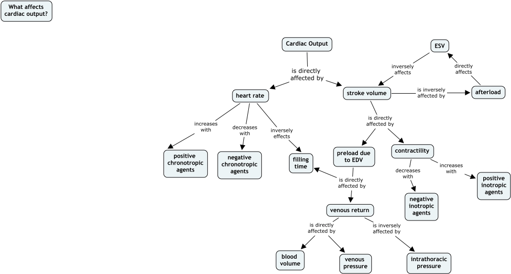 This Concept Map, created with IHMC CmapTools, has information related to: JillTichyTutorial, heart rate decreases with negative chronotropic agents, ESV inversely affects stroke volume, heart rate inversely effects filling time, stroke volume is directly affected by contractility, Cardiac Output is directly affected by stroke volume, Cardiac Output is directly affected by heart rate, preload due to EDV is directly affected by venous return, venous return is directly affected by venous pressure, afterload directly affects ESV, heart rate increases with positive chronotropic agents, contractility increases with positive inotropic agents, venous return is directly affected by blood volume, stroke volume is directly affected by preload due to EDV, venous return is inversely affected by intrathoracic pressure, preload due to EDV is directly affected by filling time, contractility decreases with negative inotropic agents, stroke volume is inversely affected by afterload