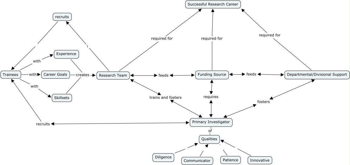 This Concept Map, created with IHMC CmapTools, has information related to: Dombrowski Map 1, Trainees with Experience, Research Team required for Successful Research Career, Research Team i recruits, Innovative Qualities, recruits Trainees, Primary Investigator trains and fosters Research Team, Funding Source feeds Research Team, Experience creates Research Team, Qualities of Primary Investigator, Diligence Qualities, Primary Investigator recruits Trainees, Departmental/Divisional Support required for Successful Research Career, Skillsets creates Research Team, Funding Source requires Primary Investigator, Trainees with Skillsets, Career Goals creates Research Team, Patience Qualities, Trainees with Career Goals, Communicator Qualities, Primary Investigator fosters Departmental/Divisional Support