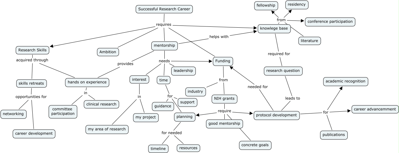 This Concept Map, created with IHMC CmapTools, has information related to: HillaryMaitlandmap1, mentorship helps with knowlege base, time for support, interest in my area of research, time for planning, mentorship needs leadership, NIH grants require good mentorship, planning for needed timeline, NIH grants require planning, knowlege base from conference participation, Successful Research Career requires Funding, mentorship provides hands on experience, planning for needed resources, Successful Research Career requires mentorship, hands on experience in clinical research, skills retreats opportunities for career development, protocol development for academic recognition, research question leads to protocol development, Successful Research Career requires Ambition, Successful Research Career requires knowlege base, knowlege base required for research question