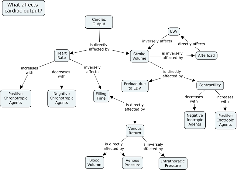 This Concept Map, created with IHMC CmapTools, has information related to: ErinAlexanderTutorial, Contractility increases with Positive Inotropic Agents, Heart Rate decreases with Negative Chronotropic Agents, Venous Return is directly affected by Blood Volume, Stroke Volume is directly affected by Preload due to EDV, Afterload directly affects ESV, Venous Return is inversely affected by Intrathoracic Pressure, Cardiac Output is directly affected by Stroke Volume, Contractility decreases with Negative Inotropic Agents, Preload due to EDV is directly affected by Filling Time, Venous Return is directly affected by Venous Pressure, Cardiac Output is directly affected by Heart Rate, Stroke Volume is directly affected by Contractility, Preload due to EDV is directly affected by Venous Return, ESV inversely affects Stroke Volume, Stroke Volume is inversely affected by Afterload, Heart Rate inversely affects Filling Time, Heart Rate increases with Positive Chronotropic Agents