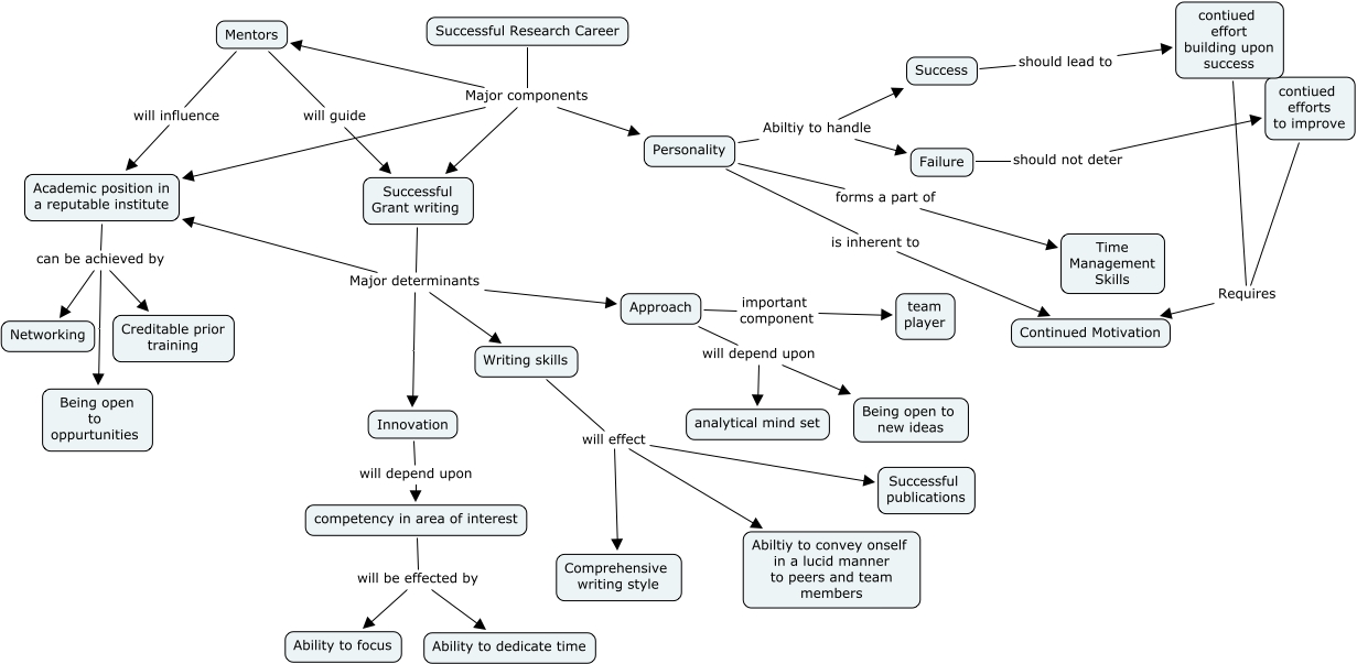 This Concept Map, created with IHMC CmapTools, has information related to: S Saini Cmap 2, Successful Grant writing Major determinants Innovation, Mentors will guide Successful Grant writing, Personality Abiltiy to handle Success, Personality forms a part of Time Management Skills, Personality Abiltiy to handle Failure, contiued effort building upon success Requires Continued Motivation, Failure should not deter contiued efforts to improve, Approach important component team player, Academic position in a reputable institute can be achieved by Networking, contiued efforts to improve Requires Continued Motivation, Successful Research Career Major components Mentors, Successful Research Career Major components Academic position in a reputable institute, Writing skills will effect Successful publications, Success should lead to contiued effort building upon success, Successful Research Career Major components Successful Grant writing, Academic position in a reputable institute can be achieved by Creditable prior training, Writing skills will effect Comprehensive writing style, Successful Research Career Major components Personality, Innovation will depend upon competency in area of interest, Successful Grant writing Major determinants Academic position in a reputable institute
