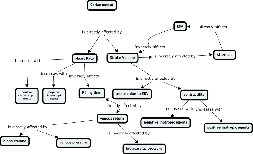 This Concept Map, created with IHMC CmapTools, has information related to: Dasha-CO CMAP 1, Cariac output Is directly affected by Stroke Volume, Heart Rate Increases with positive chronotropic agents, ESV Inversely affects Stroke Volume, preload due to EDV is directly affected by venous return, venous return is directly affected by blood volume, Stroke Volume is directly affected by contractility, contractility decreases with negative inotropic agents, Cariac output Is directly affected by Heart Rate, Afterload directly affects ESV, Stroke Volume is directly affected by preload due to EDV, preload due to EDV is directly affected by Filling time, Stroke Volume is inversely affected by Afterload, contractility Increases with positive inotropic agents, Heart Rate decreases with negative chronotropic agents, venous return is directly affected by venous pressure, venous return Is inversely affected by intracardiac pressure, Heart Rate inversely affects Filling time
