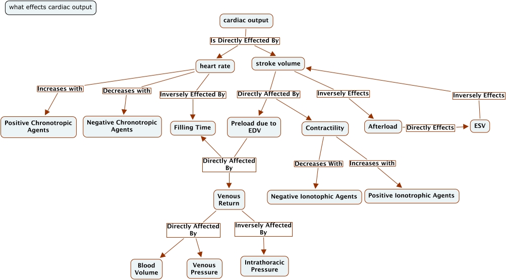 This Concept Map, created with IHMC CmapTools, has information related to: HumdumDurraniTutorial, cardiac output Is Directly Effected By heart rate, heart rate Increases with Positive Chronotropic Agents, Contractility Decreases With Negative Ionotophic Agents, stroke volume Directly Affected By Contractility, cardiac output Is Directly Effected By stroke volume, Preload due to EDV Directly Affected By Filling Time, heart rate Inversely Effected By Filling Time, stroke volume Inversely Effects Afterload, ESV Inversely Effects stroke volume, Venous Return Inversely Affected By Intrathoracic Pressure, Contractility Increases with Positive Ionotrophic Agents, Preload due to EDV Directly Affected By Venous Return, heart rate Decreases with Negative Chronotropic Agents, Venous Return Directly Affected By Blood Volume, Afterload Directly Effects ESV, Venous Return Directly Affected By Venous Pressure, stroke volume Directly Affected By Preload due to EDV