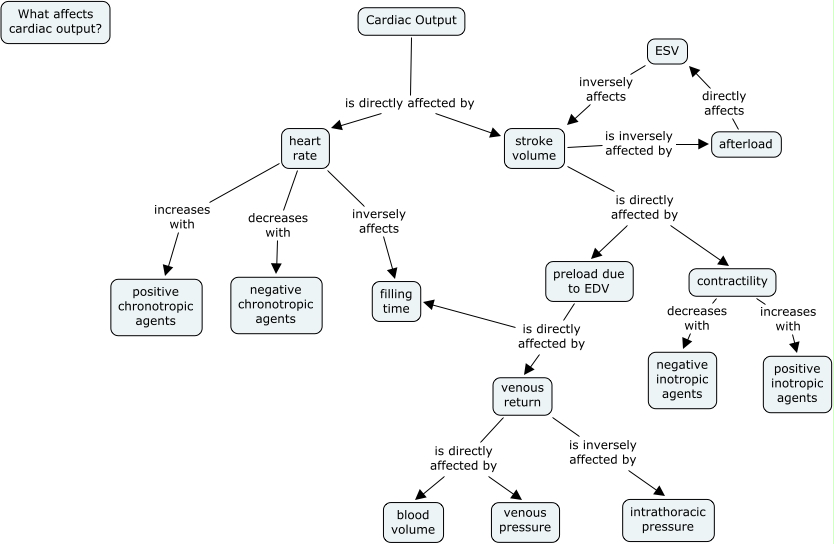 This Concept Map, created with IHMC CmapTools, has information related to: AnthonySungTutorial, Cardiac Output is directly affected by stroke volume, venous return is directly affected by blood volume, preload due to EDV is directly affected by venous return, venous return is inversely affected by intrathoracic pressure, ESV inversely affects stroke volume, afterload directly affects ESV, stroke volume is inversely affected by afterload, preload due to EDV is directly affected by filling time, heart rate decreases with negative chronotropic agents, venous return is directly affected by venous pressure, contractility increases with positive inotropic agents, contractility decreases with negative inotropic agents, heart rate inversely affects filling time, stroke volume is directly affected by preload due to EDV, Cardiac Output is directly affected by heart rate, stroke volume is directly affected by contractility, heart rate increases with positive chronotropic agents