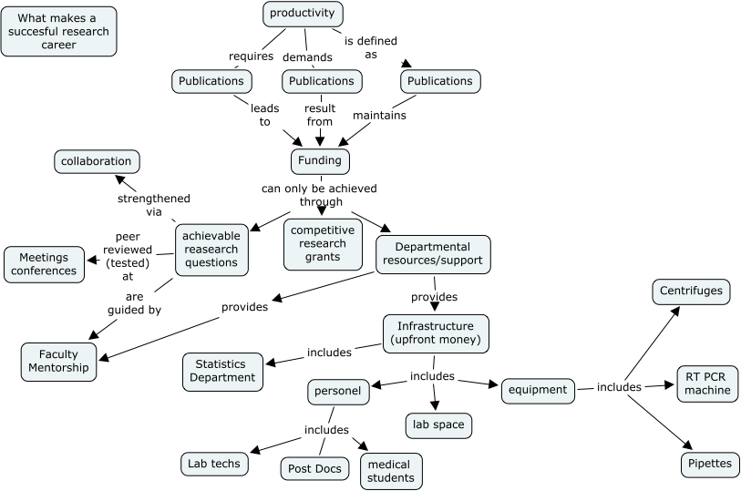 This Concept Map, created with IHMC CmapTools, has information related to: What makes a successful research career, Publications maintains Funding, Departmental resources/support provides Infrastructure (upfront money), equipment includes Pipettes, achievable reasearch questions peer reviewed (tested) at Meetings conferences, Departmental resources/support provides Faculty Mentorship, Funding can only be achieved through achievable reasearch questions, personel includes Lab techs, productivity demands Publications, equipment includes Centrifuges, personel includes Post Docs, productivity requires Publications, Publications result from Funding, equipment includes RT PCR machine, achievable reasearch questions are guided by Faculty Mentorship, personel includes medical students, Funding can only be achieved through Departmental resources/support, Publications leads to Funding, Infrastructure (upfront money) includes lab space, Infrastructure (upfront money) includes Statistics Department, Infrastructure (upfront money) includes personel
