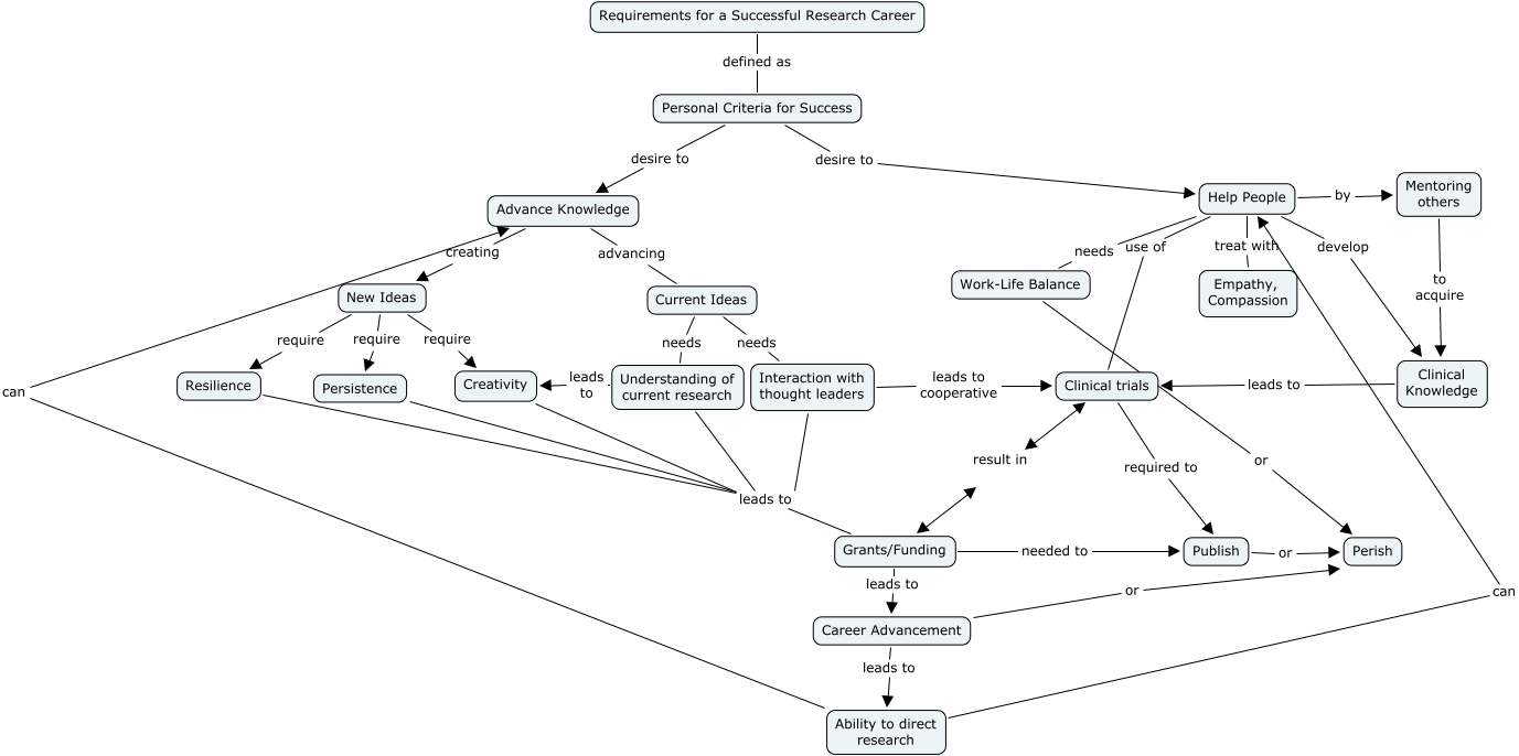 This Concept Map, created with IHMC CmapTools, has information related to: Successful Research Career, Ability to direct research can Help People, Career Advancement or Perish, Requirements for a Successful Research Career defined as Personal Criteria for Success, Persistence leads to Grants/Funding, Interaction with thought leaders leads to cooperative Clinical trials, Work-Life Balance or Perish, Clinical trials required to Publish, Current Ideas needs Understanding of current research, New Ideas require Persistence, Understanding of current research leads to Grants/Funding, New Ideas require Resilience, Advance Knowledge creating New Ideas, Personal Criteria for Success desire to Help People, Grants/Funding leads to Career Advancement, Clinical Knowledge leads to Clinical trials, Help People develop Clinical Knowledge, Understanding of current research leads to Creativity, Creativity leads to Grants/Funding, New Ideas require Creativity, Advance Knowledge advancing Current Ideas