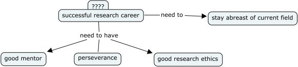 This Concept Map, created with IHMC CmapTools, has information related to: Map1, successful research career need to stay abreast of current field, ???? need to have good mentor, ???? need to have good research ethics, ???? need to have perseverance