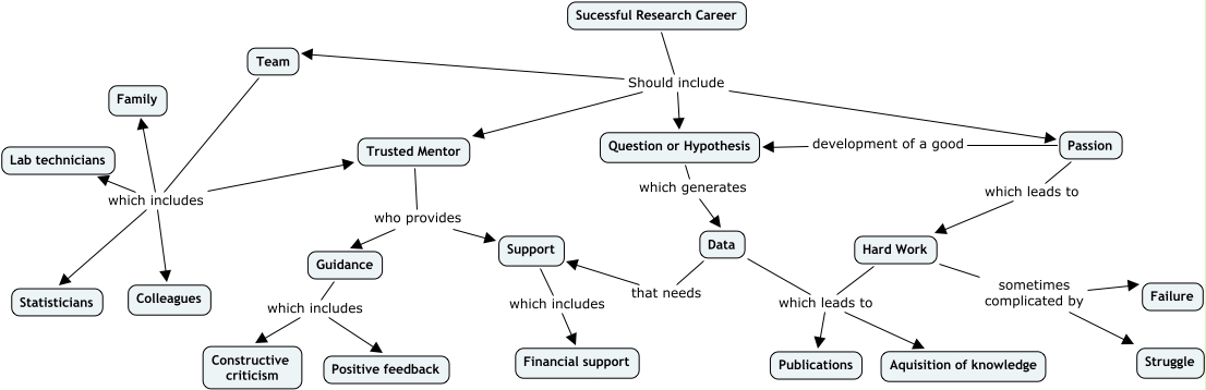 This Concept Map, created with IHMC CmapTools, has information related to: LindsayMap1RSucessfulResearchCareer, Data which leads to Publications, Sucessful Research Career Should include Question or Hypothesis, Team which includes Family, Hard Work which leads to Aquisition of knowledge, Data which leads to Aquisition of knowledge, Data that needs Support, Sucessful Research Career Should include Passion, Guidance which includes Constructive criticism, Sucessful Research Career Should include Team, Hard Work sometimes complicated by Struggle, Sucessful Research Career Should include Trusted Mentor, Guidance which includes Positive feedback, Hard Work which leads to Publications, Trusted Mentor who provides Support, Support which includes Financial support, Team which includes Colleagues, Team which includes Lab technicians, Team which includes Statisticians, Team which includes Trusted Mentor, Hard Work sometimes complicated by Failure