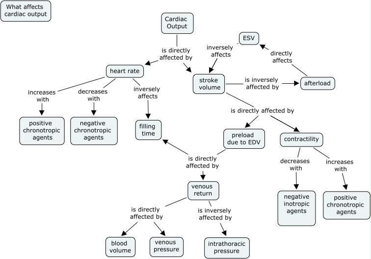 This Concept Map, created with IHMC CmapTools, has information related to: KeithDombrowskiTutorial, heart rate inversely affects filling time, venous return is directly affected by venous pressure, heart rate decreases with negative chronotropic agents, preload due to EDV is directly affected by venous return, contractility decreases with negative inotropic agents, stroke volume is directly affected by contractility, Cardiac Output is directly affected by heart rate, preload due to EDV is directly affected by filling time, stroke volume is inversely affected by afterload, venous return is inversely affected by intrathoracic pressure, heart rate increases with positive chronotropic agents, contractility increases with positive chronotropic agents, stroke volume is directly affected by preload due to EDV, afterload directly affects ESV, Cardiac Output is directly affected by stroke volume, stroke volume is directly affected by contractility, venous return is directly affected by blood volume, ESV inversely affects stroke volume, ESV inversely affects stroke volume