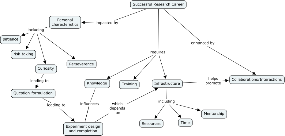 This Concept Map, created with IHMC CmapTools, has information related to: LPforResearchCareer, Question-formulation leading to Experiment design and completion, Infrastructure helps promote Collaborations/Interactions, Successful Research Career enhanced by Collaborations/Interactions, Curiosity leading to Question-formulation, Successful Research Career requires Infrastructure, Experiment design and completion which depends on Infrastructure, Personal characteristics including patience, Successful Research Career requires Training, Successful Research Career impacted by Personal characteristics, Knowledge influences Experiment design and completion, Knowledge influences Experiment design and completion, Infrastructure including Mentorship, Infrastructure including Time, Personal characteristics including Curiosity, Successful Research Career requires Knowledge, Personal characteristics including risk-taking, Infrastructure including Resources, Personal characteristics including Perseverence