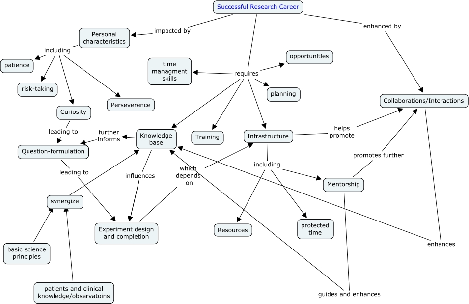 This Concept Map, created with IHMC CmapTools, has information related to: LPforResearchCareer2nd, Question-formulation leading to Experiment design and completion, basic science principles Knowledge base, Infrastructure helps promote Collaborations/Interactions, Knowledge base further informs Question-formulation, Curiosity leading to Question-formulation, Successful Research Career requires Infrastructure, Successful Research Career requires time managment skills, Experiment design and completion which depends on Infrastructure, Collaborations/Interactions enhances Knowledge base, Personal characteristics including patience, Successful Research Career enhanced by Collaborations/Interactions, Successful Research Career impacted by Personal characteristics, Successful Research Career requires Training, Knowledge base influences Experiment design and completion, Infrastructure including Mentorship, Knowledge base influences Experiment design and completion, Mentorship guides and enhances Knowledge base, Successful Research Career requires planning, patients and clinical knowledge/observatoins ???? synergize, Infrastructure including protected time