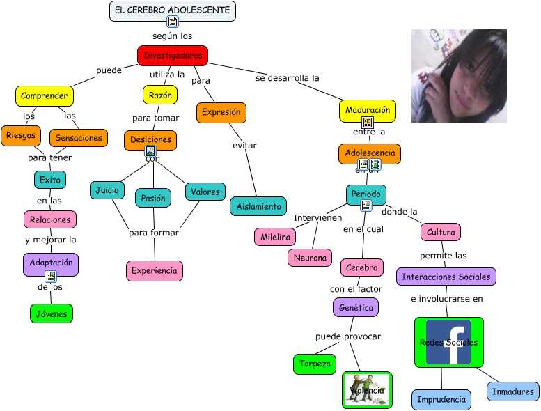 Este Cmap, tiene información relacionada con: El cerebro adolescente, Desiciones con Valores, Investigadores puede Comprender, Valores para formar Experiencia, Maduración entre la Adolescencia, Sensaciones para tener Exito, Cultura permite las Interacciones Sociales, Pasión para formar Experiencia, Investigadores se desarrolla la Maduración, ???? para Expresión, Relaciones y mejorar la Adaptación, Riesgos para tener Exito, Genética puede provocar Torpeza, EL CEREBRO ADOLESCENTE según los Investigadores, Expresión evitar Aislamiento, Juicio para formar Experiencia, Redes Sociales Evitando Imprudencia, Razón para tomar Desiciones, Comprender los Riesgos, Desiciones con Juicio, Desiciones con Pasión