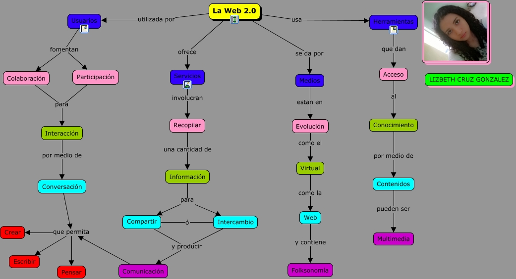 Este Cmap, tiene información relacionada con: La Web 2.0, Conversación que permita Pensar, La Web 2.0 usa Herramientas, Compartir y producir Comunicación, Compartir y producir Intercambio, Conversación que permita Escribir, Comunicación que permita Crear, Evolución como el Virtual, La Web 2.0 se da por Medios, Contenidos pueden ser Multimedia, Interacción por medio de Conversación, Comunicación que permita Pensar, Conversación que permita Crear, Información para Intercambio, Colaboración para Interacción, Usuarios fomentan Colaboración, Conocimiento por medio de Contenidos, La Web 2.0 utilizada por Usuarios, Herramientas que dan Acceso, Comunicación que permita Escribir, Usuarios fomentan Participación