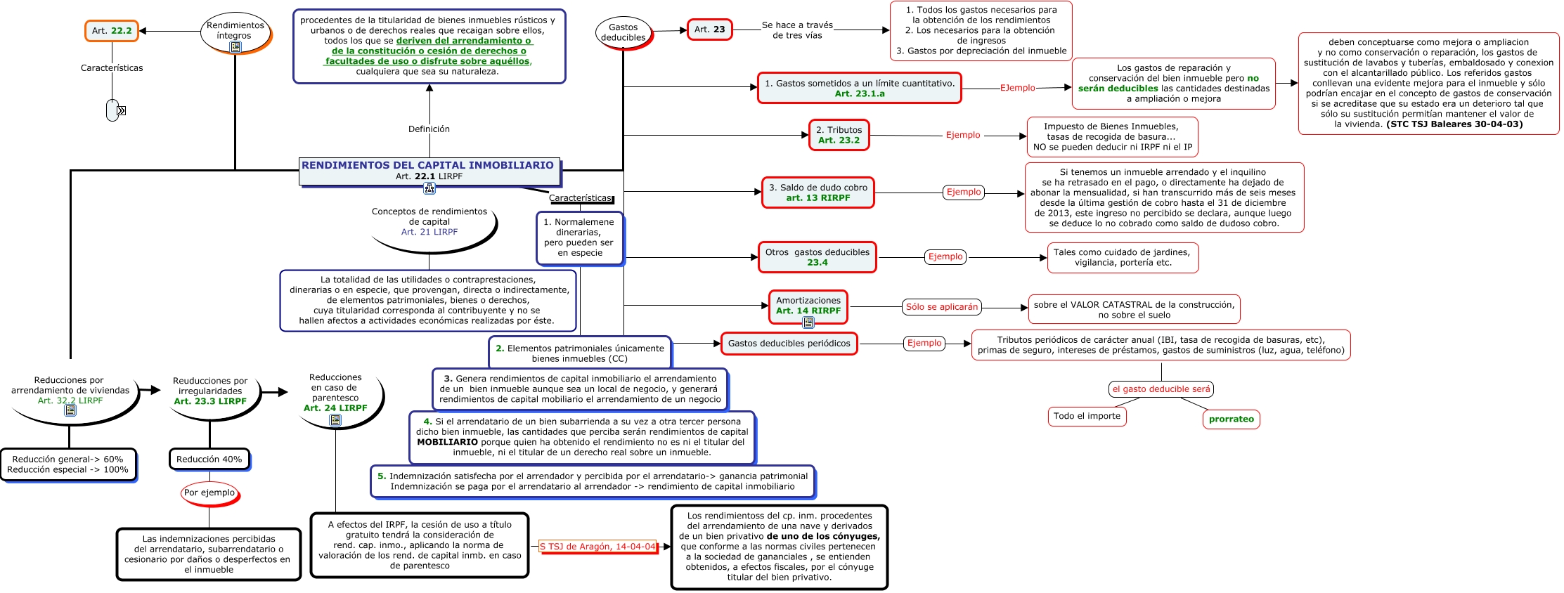 Este Cmap, tiene información relacionada con: Rend. capital inmobiliario, RENDIMIENTOS DEL CAPITAL INMOBILIARIO Art. 22.1 LIRPF Gastos deducibles Art. 23, Los gastos de reparación y conservación del bien inmueble pero no serán deducibles las cantidades destinadas a ampliación o mejora ???? deben conceptuarse como mejora o ampliacion y no como conservación o reparación, los gastos de sustitución de lavabos y tuberías, embaldosado y conexion con el alcantarillado público. Los referidos gastos conllevan una evidente mejora para el inmueble y sólo podrían encajar en el concepto de gastos de conservación si se acreditase que su estado era un deterioro tal que sólo su sustitución permitían mantener el valor de la vivienda. (STC TSJ Baleares 30-04-03), Art. 22.2 Características 1. Se computan con RI toda cantidad que se perciba: cuota de alquiler, de usufructo..., cantidad que se percibe por participación en el derecho de traspaso, 1. Gastos sometidos a un límite cuantitativo. Art. 23.1.a EJemplo Los gastos de reparación y conservación del bien inmueble pero no serán deducibles las cantidades destinadas a ampliación o mejora, Tributos periódicos de carácter anual (IBI, tasa de recogida de basuras, etc), primas de seguro, intereses de préstamos, gastos de suministros (luz, agua, teléfono) el gasto deducible será prorrateo, RENDIMIENTOS DEL CAPITAL INMOBILIARIO Art. 22.1 LIRPF Reducciones por arrendamiento de viviendas Art. 32.2 LIRPF Reuducciones por irregularidades Art. 23.3 LIRPF, Reuducciones por irregularidades Art. 23.3 LIRPF ???? Reducción 40%, 2. Tributos Art. 23.2 Ejemplo Impuesto de Bienes Inmuebles, tasas de recogida de basura... NO se pueden deducir ni IRPF ni el IP, Tributos periódicos de carácter anual (IBI, tasa de recogida de basuras, etc), primas de seguro, intereses de préstamos, gastos de suministros (luz, agua, teléfono) el gasto deducible será Todo el importe, 3. Saldo de dudo cobro art. 13 RIRPF Ejemplo Si tenemos un inmueble arrendado y el inquilino se ha retrasado en el pago, o directamente ha dejado de abonar la mensualidad, si han transcurrido más de seis meses desde la última gestión de cobro hasta el 31 de diciembre de 2013, este ingreso no percibido se declara, aunque luego se deduce lo no cobrado como saldo de dudoso cobro., Reducciones en caso de parentesco Art. 24 LIRPF ???? A efectos del IRPF, la cesión de uso a título gratuito tendrá la consideración de rend. cap. inmo., aplicando la norma de valoración de los rend. de capital inmb. en caso de parentesco, RENDIMIENTOS DEL CAPITAL INMOBILIARIO Art. 22.1 LIRPF Características 1. Normalemene dinerarias, pero pueden ser en especie, Art. 23 Se hace a través de tres vías 1. Todos los gastos necesarios para la obtención de los rendimientos 2. Los necesarios para la obtención de ingresos 3. Gastos por depreciación del inmueble, RENDIMIENTOS DEL CAPITAL INMOBILIARIO Art. 22.1 LIRPF Conceptos de rendimientos de capital Art. 21 LIRPF La totalidad de las utilidades o contraprestaciones, dinerarias o en especie, que provengan, directa o indirectamente, de elementos patrimoniales, bienes o derechos, cuya titularidad corresponda al contribuyente y no se hallen afectos a actividades económicas realizadas por éste., RENDIMIENTOS DEL CAPITAL INMOBILIARIO Art. 22.1 LIRPF Gastos deducibles Otros gastos deducibles 23.4, Art. 22.2 Características 2. Si en el alquiler de un bien inmueble, junto a él se incluye la cesión de bienes muebles que están en él, una parte de la cuantía de ese alquiler se debe a esa cesión de bienes muebles y, esa parte de la cuantía de alquiler se considera rendimiento de capital inmobiliario, RENDIMIENTOS DEL CAPITAL INMOBILIARIO Art. 22.1 LIRPF Gastos deducibles 1. Gastos sometidos a un límite cuantitativo. Art. 23.1.a, RENDIMIENTOS DEL CAPITAL INMOBILIARIO Art. 22.1 LIRPF Reducciones por arrendamiento de viviendas Art. 32.2 LIRPF Reducción general-> 60% Reducción especial -> 100%, Reducción 40% Por ejemplo Las indemnizaciones percibidas del arrendatario, subarrendatario o cesionario por daños o desperfectos en el inmueble, 4. Si el arrendatario de un bien subarrienda a su vez a otra tercer persona dicho bien inmueble, las cantidades que perciba serán rendimientos de capital MOBILIARIO porque quien ha obtenido el rendimiento no es ni el titular del inmueble, ni el titular de un derecho real sobre un inmueble. ???? 5. Indemnización satisfecha por el arrendador y percibida por el arrendatario-> ganancia patrimonial Indemnización se paga por el arrendatario al arrendador -> rendimiento de capital inmobiliario