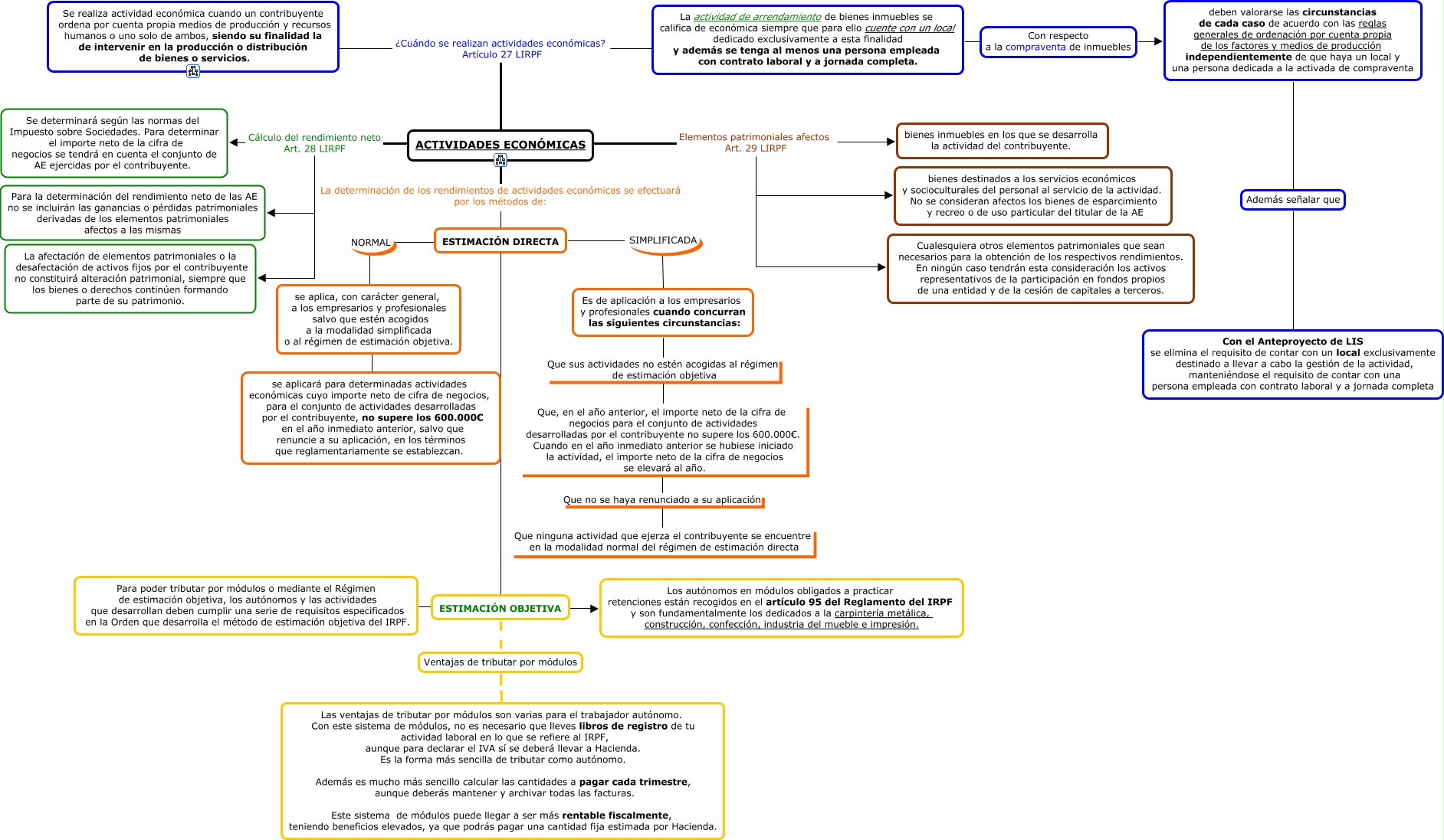 Este Cmap, tiene información relacionada con: act. economicas, ESTIMACIÓN DIRECTA SIMPLIFICADA Es de aplicación a los empresarios y profesionales cuando concurran las siguientes circunstancias:, ACTIVIDADES ECONÓMICAS Elementos patrimoniales afectos Art. 29 LIRPF Cualesquiera otros elementos patrimoniales que sean necesarios para la obtención de los respectivos rendimientos. En ningún caso tendrán esta consideración los activos representativos de la participación en fondos propios de una entidad y de la cesión de capitales a terceros., ACTIVIDADES ECONÓMICAS La determinación de los rendimientos de actividades económicas se efectuará por los métodos de: ESTIMACIÓN DIRECTA, ESTIMACIÓN OBJETIVA ???? Para poder tributar por módulos o mediante el Régimen de estimación objetiva, los autónomos y las actividades que desarrollan deben cumplir una serie de requisitos especificados en la Orden que desarrolla el método de estimación objetiva del IRPF., ESTIMACIÓN OBJETIVA Ventajas de tributar por módulos Las ventajas de tributar por módulos son varias para el trabajador autónomo. Con este sistema de módulos, no es necesario que lleves libros de registro de tu actividad laboral en lo que se refiere al IRPF, aunque para declarar el IVA sí se deberá llevar a Hacienda. Es la forma más sencilla de tributar como autónomo. Además es mucho más sencillo calcular las cantidades a pagar cada trimestre, aunque deberás mantener y archivar todas las facturas. Este sistema de módulos puede llegar a ser más rentable fiscalmente, teniendo beneficios elevados, ya que podrás pagar una cantidad fija estimada por Hacienda., ACTIVIDADES ECONÓMICAS La determinación de los rendimientos de actividades económicas se efectuará por los métodos de: ESTIMACIÓN OBJETIVA, ACTIVIDADES ECONÓMICAS Cálculo del rendimiento neto Art. 28 LIRPF Se determinará según las normas del Impuesto sobre Sociedades. Para determinar el importe neto de la cifra de negocios se tendrá en cuenta el conjunto de AE ejercidas por el contribuyente., ACTIVIDADES ECONÓMICAS ¿Cuándo se realizan actividades económicas? Artículo 27 LIRPF Se realiza actividad económica cuando un contribuyente ordena por cuenta propia medios de producción y recursos humanos o uno solo de ambos, siendo su finalidad la de intervenir en la producción o distribución de bienes o servicios., ACTIVIDADES ECONÓMICAS Elementos patrimoniales afectos Art. 29 LIRPF bienes inmuebles en los que se desarrolla la actividad del contribuyente., ACTIVIDADES ECONÓMICAS Cálculo del rendimiento neto Art. 28 LIRPF Para la determinación del rendimiento neto de las AE no se incluirán las ganancias o pérdidas patrimoniales derivadas de los elementos patrimoniales afectos a las mismas, ACTIVIDADES ECONÓMICAS Elementos patrimoniales afectos Art. 29 LIRPF bienes destinados a los servicios económicos y socioculturales del personal al servicio de la actividad. No se consideran afectos los bienes de esparcimiento y recreo o de uso particular del titular de la AE, se aplica, con carácter general, a los empresarios y profesionales salvo que estén acogidos a la modalidad simplificada o al régimen de estimación objetiva. ???? se aplicará para determinadas actividades económicas cuyo importe neto de cifra de negocios, para el conjunto de actividades desarrolladas por el contribuyente, no supere los 600.000€ en el año inmediato anterior, salvo que renuncie a su aplicación, en los términos que reglamentariamente se establezcan., ESTIMACIÓN DIRECTA NORMAL se aplica, con carácter general, a los empresarios y profesionales salvo que estén acogidos a la modalidad simplificada o al régimen de estimación objetiva., Que, en el año anterior, el importe neto de la cifra de negocios para el conjunto de actividades desarrolladas por el contribuyente no supere los 600.000€. Cuando en el año inmediato anterior se hubiese iniciado la actividad, el importe neto de la cifra de negocios se elevará al año. Que no se haya renunciado a su aplicación Que ninguna actividad que ejerza el contribuyente se encuentre en la modalidad normal del régimen de estimación directa, ESTIMACIÓN OBJETIVA ???? Los autónomos en módulos obligados a practicar retenciones están recogidos en el artículo 95 del Reglamento del IRPF y son fundamentalmente los dedicados a la carpintería metálica, construcción, confección, industria del mueble e impresión., deben valorarse las circunstancias de cada caso de acuerdo con las reglas generales de ordenación por cuenta propia de los factores y medios de producción independientemente de que haya un local y una persona dedicada a la activada de compraventa Además señalar que Con el Anteproyecto de LIS se elimina el requisito de contar con un local exclusivamente destinado a llevar a cabo la gestión de la actividad, manteniéndose el requisito de contar con una persona empleada con contrato laboral y a jornada completa, ACTIVIDADES ECONÓMICAS Cálculo del rendimiento neto Art. 28 LIRPF La afectación de elementos patrimoniales o la desafectación de activos fijos por el contribuyente no constituirá alteración patrimonial, siempre que los bienes o derechos continúen formando parte de su patrimonio., Es de aplicación a los empresarios y profesionales cuando concurran las siguientes circunstancias: Que sus actividades no estén acogidas al régimen de estimación objetiva Que, en el año anterior, el importe neto de la cifra de negocios para el conjunto de actividades desarrolladas por el contribuyente no supere los 600.000€. Cuando en el año inmediato anterior se hubiese iniciado la actividad, el importe neto de la cifra de negocios se elevará al año., ACTIVIDADES ECONÓMICAS ¿Cuándo se realizan actividades económicas? Artículo 27 LIRPF La actividad de arrendamiento de bienes inmuebles se califica de económica siempre que para ello cuente con un local dedicado exclusivamente a esta finalidad y además se te