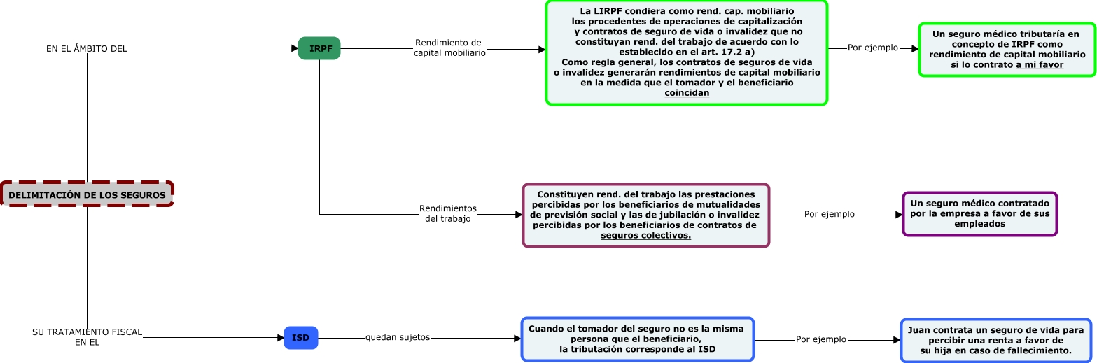 Este Cmap, tiene información relacionada con: CASO PRACTICO, ???? Por ejemplo Un seguro médico tributaría en concepto de IRPF como rendimiento de capital mobiliario si lo contrato a mi favor, Constituyen rend. del trabajo las prestaciones percibidas por los beneficiarios de mutualidades de previsión social y las de jubilación o invalidez percibidas por los beneficiarios de contratos de seguros colectivos. Por ejemplo Un seguro médico contratado por la empresa a favor de sus empleados, Cuando el tomador del seguro no es la misma persona que el beneficiario, la tributación corresponde al ISD Por ejemplo Juan contrata un seguro de vida para percibir una renta a favor de su hija en caso de fallecimiento., DELIMITACIÓN DE LOS SEGUROS SU TRATAMIENTO FISCAL EN EL ISD, ISD quedan sujetos Cuando el tomador del seguro no es la misma persona que el beneficiario, la tributación corresponde al ISD, IRPF Rendimiento de capital mobiliario La LIRPF condiera como rend. cap. mobiliario los procedentes de operaciones de capitalización y contratos de seguro de vida o invalidez que no constituyan rend. del trabajo de acuerdo con lo establecido en el art. 17.2 a) Como regla general, los contratos de seguros de vida o invalidez generarán rendimientos de capital mobiliario en la medida que el tomador y el beneficiario coincidan, IRPF Rendimientos del trabajo Constituyen rend. del trabajo las prestaciones percibidas por los beneficiarios de mutualidades de previsión social y las de jubilación o invalidez percibidas por los beneficiarios de contratos de seguros colectivos., DELIMITACIÓN DE LOS SEGUROS EN EL ÁMBITO DEL IRPF