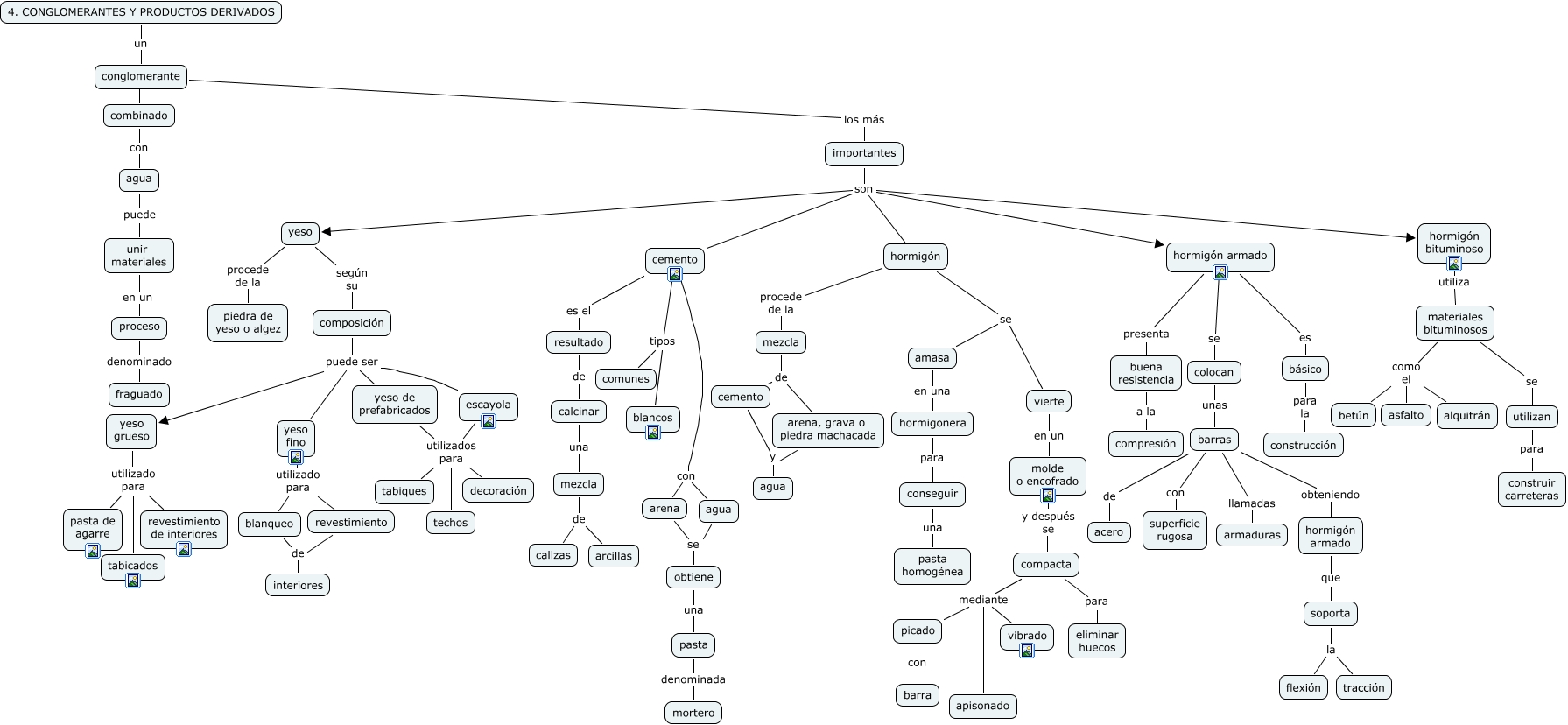 Este Cmap, tiene información relacionada con: 4. Conglomerantes y productos derivados, cemento con arena, conglomerante los más importantes, yeso según su composición, mezcla de calizas, arena se obtiene, mezcla de arena, grava o piedra machacada, importantes son cemento, compacta para eliminar huecos, escayola utilizados para decoración, combinado con agua, 4. CONGLOMERANTES Y PRODUCTOS DERIVADOS un conglomerante, yeso grueso utilizado para tabicados, resultado de calcinar, yeso procede de la piedra de yeso o algez, yeso fino utilizado para blanqueo, vierte en un molde o encofrado, hormigón armado es básico, cemento con agua, importantes son hormigón, composición puede ser yeso fino
