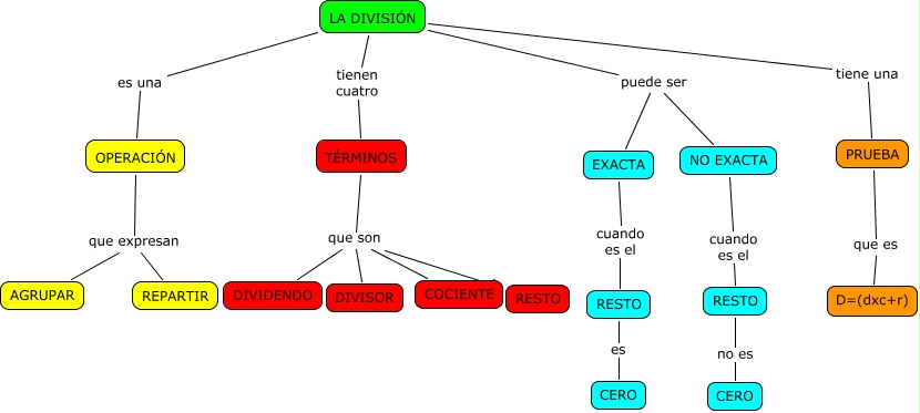 Este Cmap, tiene información relacionada con: LA DIVISIÓN-Borja, LA DIVISIÓN puede ser EXACTA, TÉRMINOS que son RESTO, LA DIVISIÓN tiene una PRUEBA, OPERACIÓN que expresan AGRUPAR, TÉRMINOS que son DIVISOR, TÉRMINOS que son COCIENTE, PRUEBA que es D=(dxc+r), NO EXACTA cuando es el RESTO, LA DIVISIÓN es una OPERACIÓN, RESTO es CERO, OPERACIÓN que expresan REPARTIR, RESTO no es CERO, LA DIVISIÓN puede ser NO EXACTA, EXACTA cuando es el RESTO, LA DIVISIÓN tienen cuatro TÉRMINOS, TÉRMINOS que son DIVIDENDO