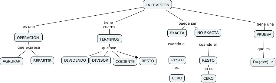 Este Cmap, tiene información relacionada con: LA DIVISIÓN-Nerea, LA DIVISIÓN tiene cuatro TÉRMINOS, LA DIVISIÓN puede ser NO EXACTA, OPERACIÓN que expresa REPARTIR, LA DIVISIÓN puede ser EXACTA, TÉRMINOS que son RESTO, RESTO no es CERO, RESTO es CERO, TÉRMINOS que son COCIENTE, PRUEBA que es D=(dxc)+r, LA DIVISIÓN es una OPERACIÓN, NO EXACTA cuando el RESTO, TÉRMINOS que son DIVISOR, LA DIVISIÓN tiene una PRUEBA, OPERACIÓN que expresa AGRUPAR, EXACTA cuando el RESTO, TÉRMINOS que son DIVIDENDO