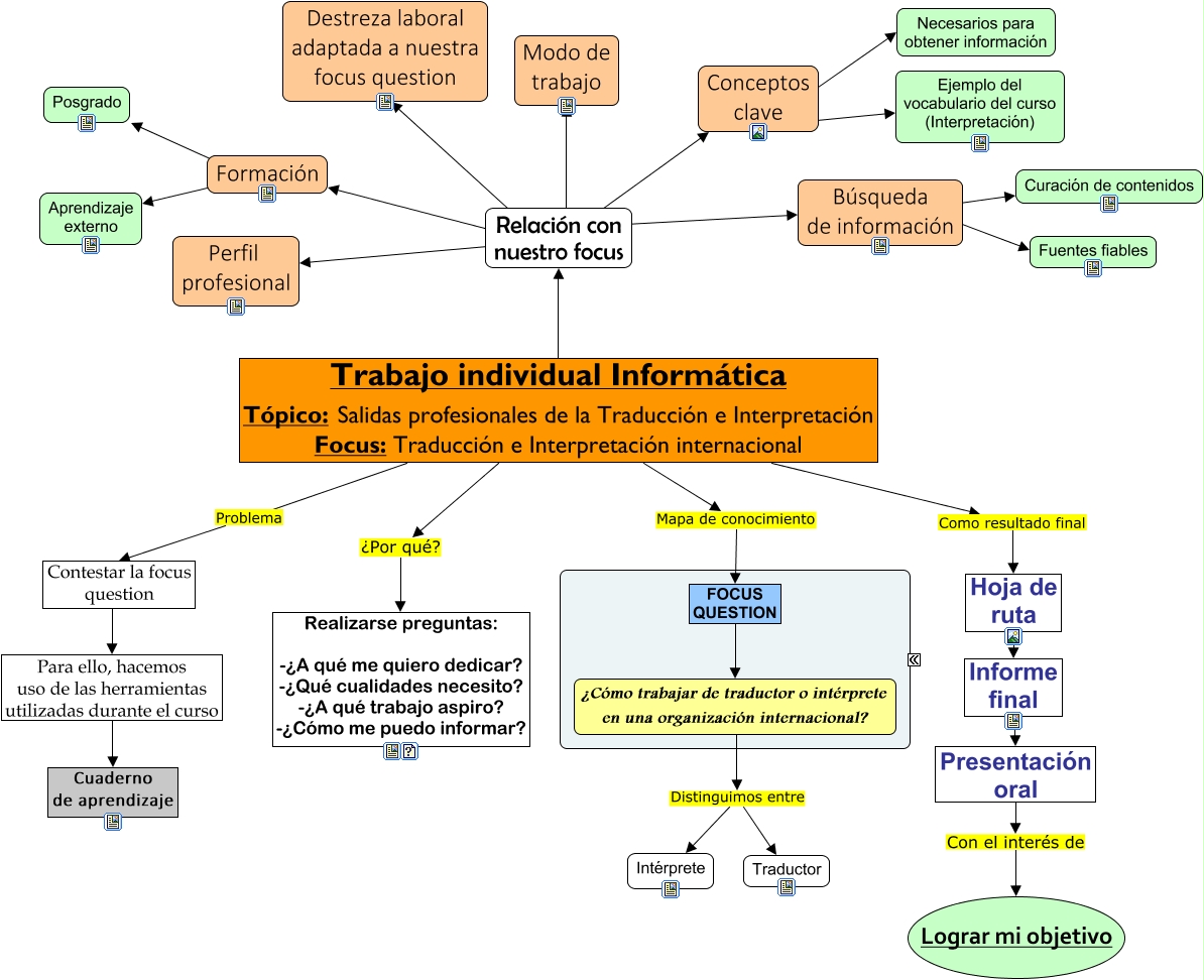 Este Cmap, tiene información relacionada con: Cmap fin de curso, Relación con nuestro focus ???? Búsqueda de información, Trabajo individual Informática Tópico: Salidas profesionales de la Traducción e Interpretación Focus: Traducción e Interpretación internacional Problema Contestar la focus question, Conceptos clave ???? Necesarios para obtener información, Búsqueda de información ???? Curación de contenidos, Relación con nuestro focus ???? Formación, Relación con nuestro focus ???? Destreza laboral adaptada a nuestra focus question, Trabajo individual Informática Tópico: Salidas profesionales de la Traducción e Interpretación Focus: Traducción e Interpretación internacional Mapa de conocimiento FOCUS QUESTION, Formación ???? Aprendizaje externo, Trabajo individual Informática Tópico: Salidas profesionales de la Traducción e Interpretación Focus: Traducción e Interpretación internacional ¿Por qué? Realizarse preguntas: -¿A qué me quiero dedicar? -¿Qué cualidades necesito? -¿A qué trabajo aspiro? -¿Cómo me puedo informar?, Búsqueda de información ???? Fuentes fiables, Relación con nuestro focus ???? Modo de trabajo, ¿Cómo trabajar de traductor o intérprete en una organización internacional? Distinguimos entre Intérprete, Trabajo individual Informática Tópico: Salidas profesionales de la Traducción e Interpretación Focus: Traducción e Interpretación internacional Como resultado final Hoja de ruta, Informe final ???? Presentación oral, Relación con nuestro focus ???? Conceptos clave, Hoja de ruta ???? Informe final, Para ello, hacemos uso de las herramientas utilizadas durante el curso ???? Cuaderno de aprendizaje, Presentación oral Con el interés de Lograr mi objetivo, Conceptos clave ???? Ejemplo del vocabulario del curso (Interpretación), FOCUS QUESTION ???? ¿Cómo trabajar de traductor o intérprete en una organización internacional?