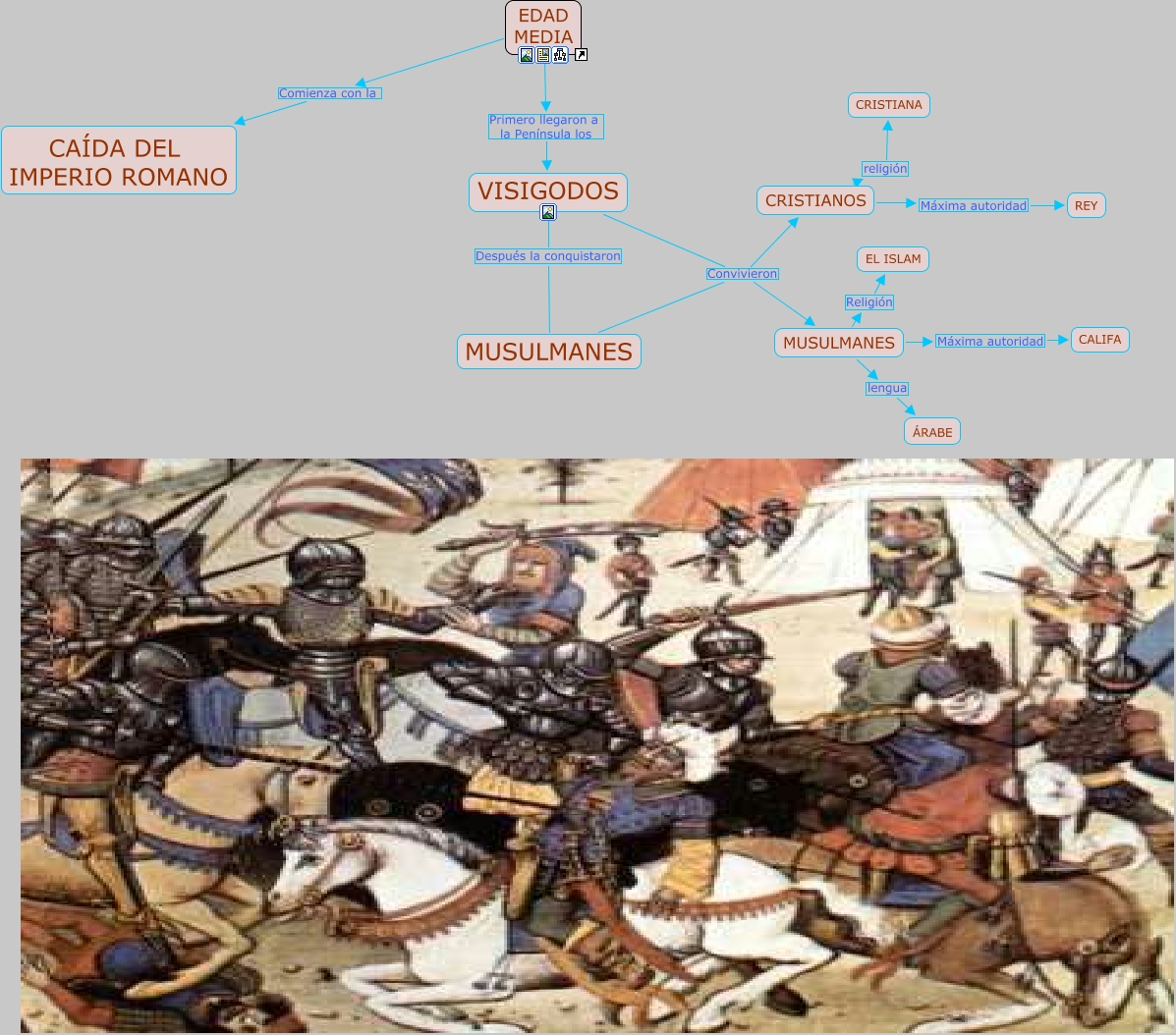 Este Cmap, tiene información relacionada con: EDAD MEDIA, CRISTIANOS Máxima autoridad REY, MUSULMANES Convivieron MUSULMANES, EDAD MEDIA Primero llegaron a la Península los VISIGODOS, VISIGODOS Después la conquistaron MUSULMANES, MUSULMANES Máxima autoridad CALIFA, CRISTIANOS religión CRISTIANA, MUSULMANES Convivieron CRISTIANOS, MUSULMANES Religión EL ISLAM, MUSULMANES lengua �?RABE, EDAD MEDIA Comienza con la CA�?DA DEL IMPERIO ROMANO, VISIGODOS Convivieron MUSULMANES, VISIGODOS Convivieron CRISTIANOS
