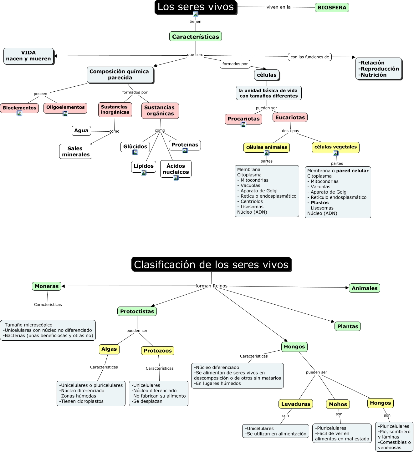 Este Cmap, tiene información relacionada con: Los seres vivos y su clasificación, Clasificación de los seres vivos forman Reinos Protoctistas, Sustancias inorgánicas como Agua, Clasificación de los seres vivos forman Reinos Moneras, Sustancias inorgánicas como Sales minerales, células pueden ser Procariotas, Algas Características -Unicelulares o pluricelulares -Núcleo diferenciado -Zonas húmedas -Tienen cloroplastos, células vegetales partes Membrana o pared celular Citoplasma - Mitocondrias - Vacuolas - Aparato de Golgi - Retículo endosplasmático - Plastos - Lisosomas Núcleo (ADN), Características que son: células, Eucariotas dos tipos células vegetales, Clasificación de los seres vivos forman Reinos Hongos, Hongos pueden ser Mohos, Hongos pueden ser Levaduras, Sustancias orgánicas como Proteinas, Mohos son -Pluricelulares -Facil de ver en alimentos en mal estado, células animales partes Membrana Citoplasma - Mitocondrias - Vacuolas - Aparato de Golgi - Retículo endosplasmático - Centriolos - Lisosomas Núcleo (ADN), Composición química parecida poseen Oligoelementos, Protozoos Características -Unicelulares -Núcleo diferenciado -No fabrican su alimento -Se desplazan, Sustancias orgánicas como Ácidos nucleicos, Protoctistas pueden ser Protozoos, Hongos Características -Núcleo diferenciado -Se alimentan de seres vivos en descomposición o de otros sin matarlos -En lugares húmedos