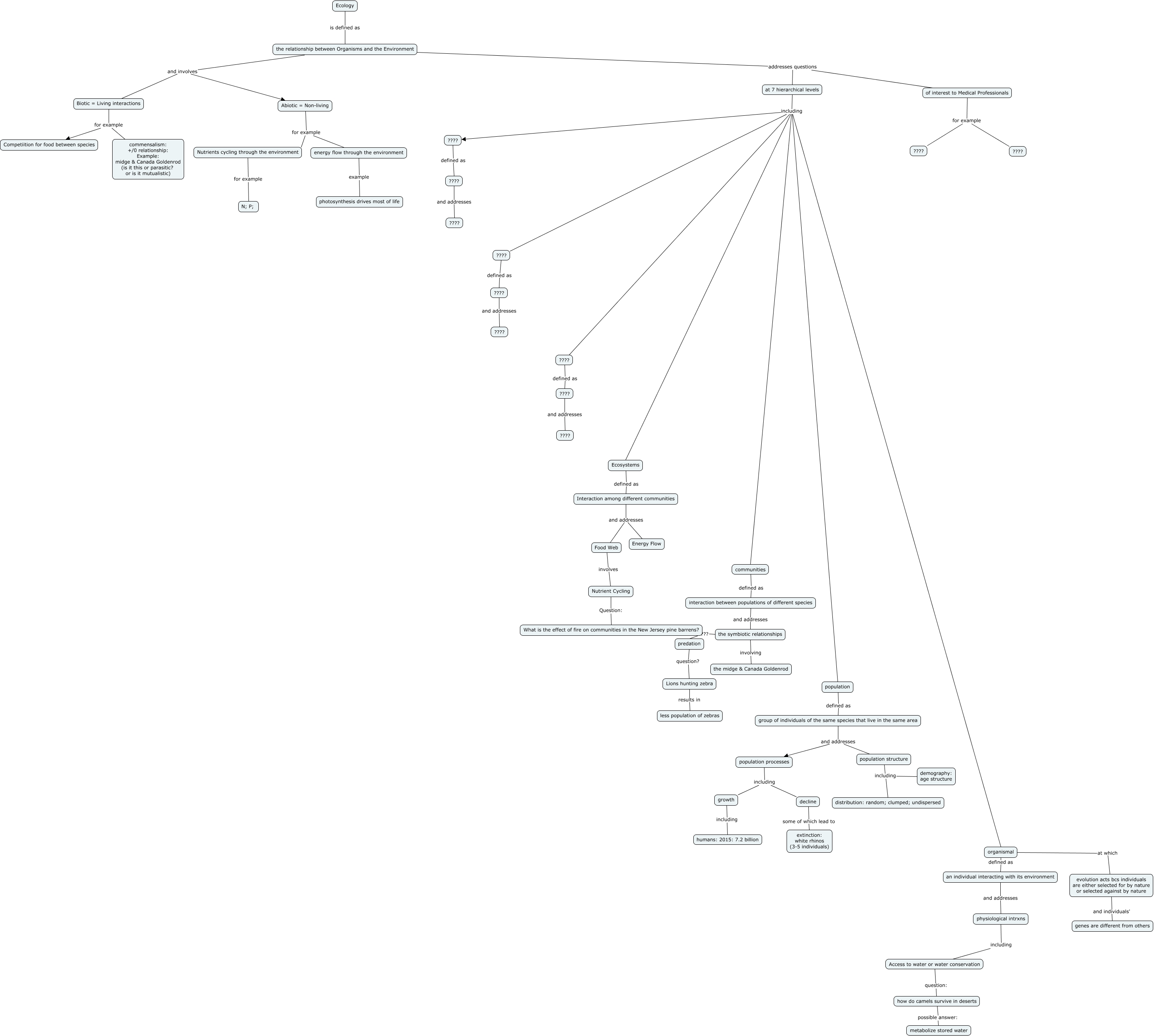 This Concept Map, created with IHMC CmapTools, has information related to: Intro to Ecology.011615, group of individuals of the same species that live in the same area and addresses population structure, ???? and addresses ????, ???? defined as ????, Food Web involves Nutrient Cycling, interaction between populations of different species and addresses the symbiotic relationships, population structure including distribution: random; clumped; undispersed, Nutrients cycling through the environment for example N; P;, Ecology is defined as the relationship between Organisms and the Environment, at 7 hierarchical levels including ????, population structure including demography: age structure, at 7 hierarchical levels including ????, communities defined as interaction between populations of different species, Abiotic = Non-living for example energy flow through the environment, ???? and addresses ????, Interaction among different communities and addresses Energy Flow, an individual interacting with its environment and addresses physiological intrxns, Ecosystems defined as Interaction among different communities, group of individuals of the same species that live in the same area and addresses population processes, organismal defined as an individual interacting with its environment, the relationship between Organisms and the Environment addresses questions at 7 hierarchical levels