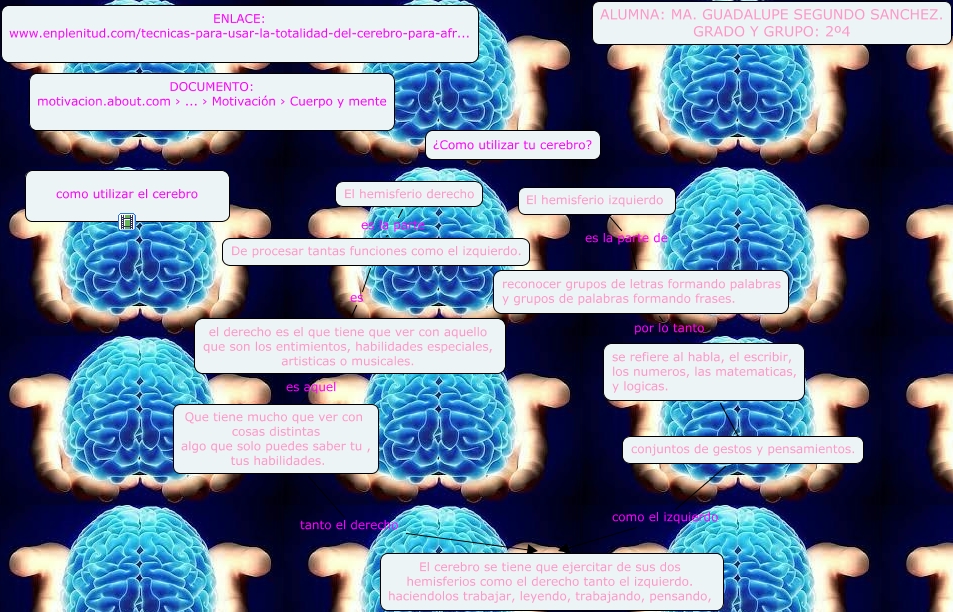 Este Cmap, tiene información relacionada con: como utilizar su cerebro, se refiere al habla, el escribir, los numeros, las matematicas, y logicas. ???? conjuntos de gestos y pensamientos., reconocer grupos de letras formando palabras y grupos de palabras formando frases. por lo tanto se refiere al habla, el escribir, los numeros, las matematicas, y logicas., El hemisferio izquierdo es la parte de reconocer grupos de letras formando palabras y grupos de palabras formando frases., El hemisferio derecho es la parte De procesar tantas funciones como el izquierdo., conjuntos de gestos y pensamientos. como el izquierdo El cerebro se tiene que ejercitar de sus dos hemisferios como el derecho tanto el izquierdo. haciendolos trabajar, leyendo, trabajando, pensando,, De procesar tantas funciones como el izquierdo. es el derecho es el que tiene que ver con aquello que son los entimientos, habilidades especiales, artisticas o musicales., Que tiene mucho que ver con cosas distintas algo que solo puedes saber tu , tus habilidades. tanto el derecho El cerebro se tiene que ejercitar de sus dos hemisferios como el derecho tanto el izquierdo. haciendolos trabajar, leyendo, trabajando, pensando,, el derecho es el que tiene que ver con aquello que son los entimientos, habilidades especiales, artisticas o musicales. es aquel Que tiene mucho que ver con cosas distintas algo que solo puedes saber tu , tus habilidades.