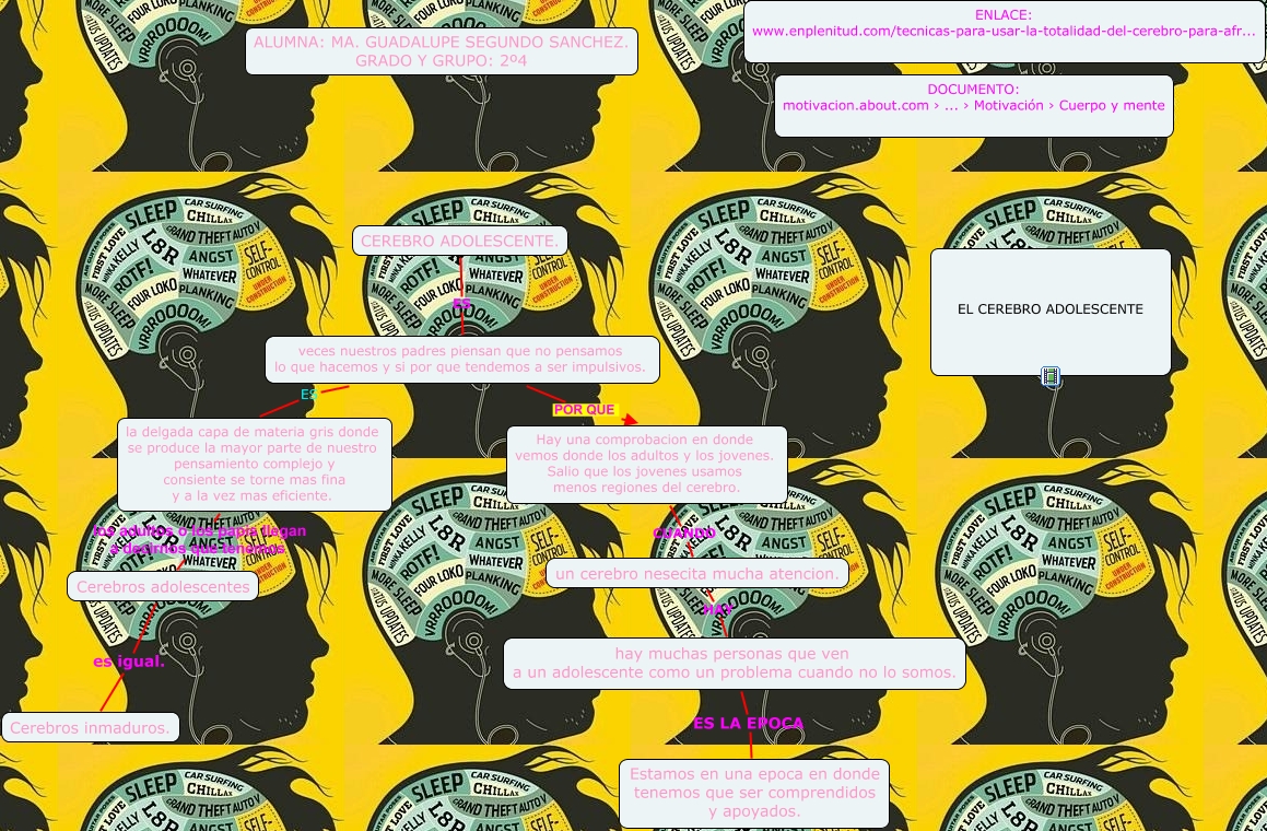 Este Cmap, tiene información relacionada con: cerebro adolescente, hay muchas personas que ven a un adolescente como un problema cuando no lo somos. ES LA EPOCA Estamos en una epoca en donde tenemos que ser comprendidos y apoyados., veces nuestros padres piensan que no pensamos lo que hacemos y si por que tendemos a ser impulsivos. POR QUE Hay una comprobacion en donde vemos donde los adultos y los jovenes. Salio que los jovenes usamos menos regiones del cerebro., Hay una comprobacion en donde vemos donde los adultos y los jovenes. Salio que los jovenes usamos menos regiones del cerebro. CUANDO un cerebro nesecita mucha atencion., la delgada capa de materia gris donde se produce la mayor parte de nuestro pensamiento complejo y consiente se torne mas fina y a la vez mas eficiente. los adultos o los papis llegan a decirnos que tenemos Cerebros adolescentes, Cerebros adolescentes es igual. Cerebros inmaduros., CEREBRO ADOLESCENTE. ES veces nuestros padres piensan que no pensamos lo que hacemos y si por que tendemos a ser impulsivos., veces nuestros padres piensan que no pensamos lo que hacemos y si por que tendemos a ser impulsivos. ES la delgada capa de materia gris donde se produce la mayor parte de nuestro pensamiento complejo y consiente se torne mas fina y a la vez mas eficiente., un cerebro nesecita mucha atencion. HAY hay muchas personas que ven a un adolescente como un problema cuando no lo somos.