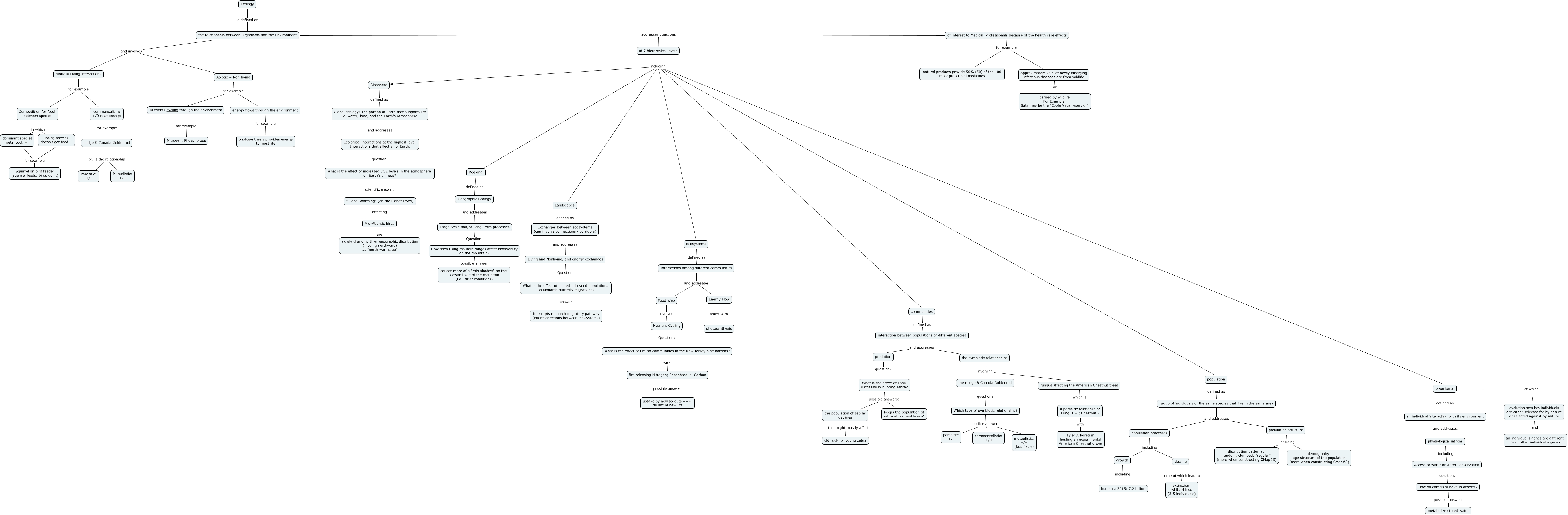 This Concept Map, created with IHMC CmapTools, has information related to: Intro to Ecology.012115, Global ecology: The portion of Earth that supports life ie. water; land, and the Earth's Atmosphere and addresses Ecological interactions at the highest level. Interactions that affect all of Earth., Approximately 75% of newly emerging infectious diseases are from wildlife or carried by wildlife For Example: Bats may be the "Ebola Virus reservior", fire releasing Nitrogen; Phosphorous; Carbon possible answer: uptake by new sprouts ==> "flush" of new life, population structure including distribution patterns: random; clumped; "regular" (more when constructing CMap#3), the symbiotic relationships involving the midge & Canada Goldenrod, Biotic = Living interactions for example commensalism: +/0 relationship:, at 7 hierarchical levels including Ecosystems, commensalism: +/0 relationship: for example midge & Canada Goldenrod, at 7 hierarchical levels including organismal, at 7 hierarchical levels including Biosphere, Energy Flow starts with photosynthesis, at 7 hierarchical levels including Landscapes, the symbiotic relationships involving fungus affecting the American Chestnut trees, group of individuals of the same species that live in the same area and addresses population structure, energy flows through the environment for example photosynthesis provides energy to most life, How does rising moutain ranges affect biodiversity on the mountain? possible answer causes more of a "rain shadow" on the leeward side of the mountain (i.e., drier conditions), population defined as group of individuals of the same species that live in the same area, at 7 hierarchical levels including communities, Exchanges between ecosystems (can involve connections / corridors) and addresses Living and Nonliving, and energy exchanges, Regional defined as Geographic Ecology