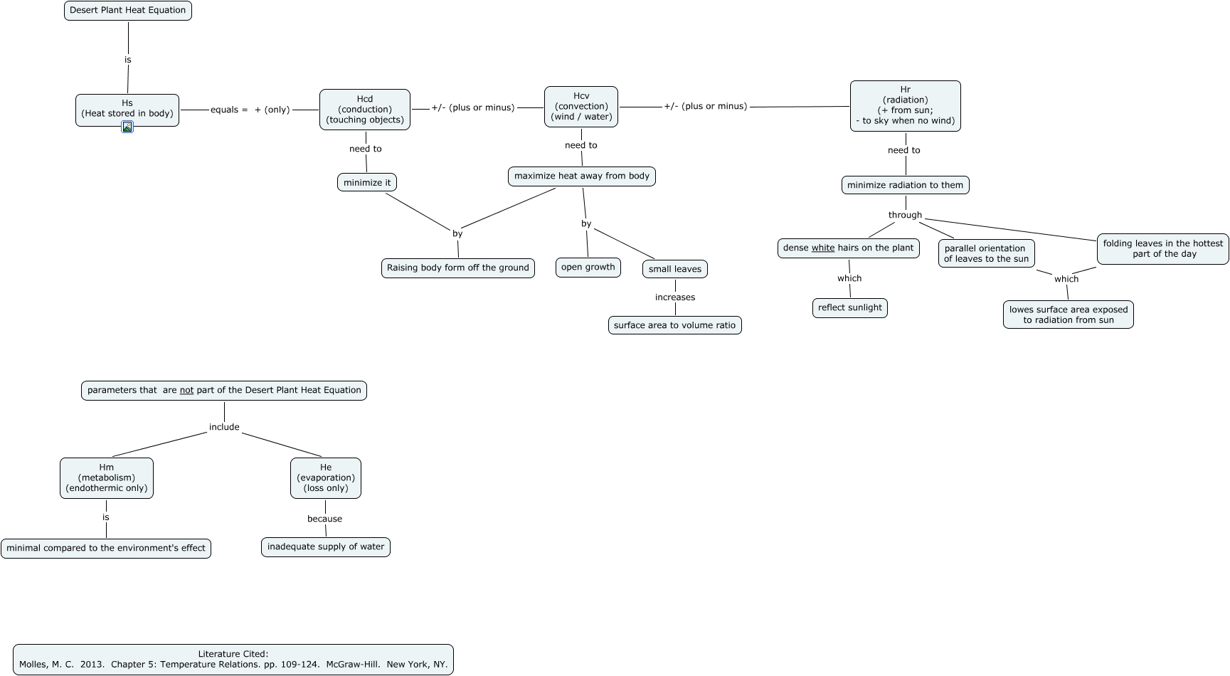 This Concept Map, created with IHMC CmapTools, has information related to: Desert Plant Heat Equation, folding leaves in the hottest part of the day which lowes surface area exposed to radiation from sun, maximize heat away from body by open growth, minimize radiation to them through parallel orientation of leaves to the sun, Hcd (conduction) (touching objects) need to minimize it, parallel orientation of leaves to the sun which lowes surface area exposed to radiation from sun, Hm (metabolism) (endothermic only) is minimal compared to the environment's effect, parameters that are not part of the Desert Plant Heat Equation include He (evaporation) (loss only), maximize heat away from body by small leaves, small leaves increases surface area to volume ratio, Hr (radiation) (+ from sun; - to sky when no wind) need to minimize radiation to them, Desert Plant Heat Equation is Hs (Heat stored in body), minimize radiation to them through folding leaves in the hottest part of the day, parameters that are not part of the Desert Plant Heat Equation include Hm (metabolism) (endothermic only), minimize radiation to them through dense white hairs on the plant, Hcd (conduction) (touching objects) +/- (plus or minus) Hcv (convection) (wind / water), Hcv (convection) (wind / water) +/- (plus or minus) Hr (radiation) (+ from sun; - to sky when no wind), Hs (Heat stored in body) equals = + (only) Hcd (conduction) (touching objects), maximize heat away from body by Raising body form off the ground, minimize it by Raising body form off the ground, Hcv (convection) (wind / water) need to maximize heat away from body