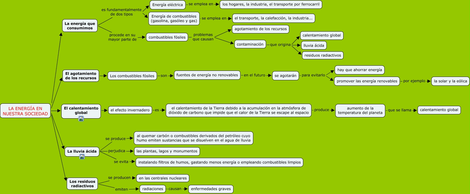 Este Cmap, tiene información relacionada con: La energía en nuestra sociedad, La lluvia ácida se produce al quemar carbón o combustibles derivados del petróleo cuyo humo emiten sustancias que se disuelven en el agua de lluvia, El calentamiento global el efecto invernadero, fuentes de energía no renovables en el futuro se agotarán, aumento de la temperatura del planeta que se llama calentamiento global, LA ENERGÍA EN NUESTRA SOCIEDAD La energía que consumimos, contaminación que origina lluvia ácida, El agotamiento de los recursos Los combustibles fósiles, se agotarán para evitarlo hay que ahorrar energía, radiaciones causan enfermedades graves, La lluvia ácida perjudica las plantas, lagos y monumentos, La energía que consumimos procede en su mayor parte de combustibles fósiles, contaminación que origina calentamiento global, LA ENERGÍA EN NUESTRA SOCIEDAD El agotamiento de los recursos, Energía eléctrica se emplea en los hogares, la industria, el transporte por ferrocarril, el calentamiento de la Tierra debido a la acumulación en la atmósfera de dióxido de carbono que impide que el calor de la Tierra se escape al espacio produce aumento de la temperatura del planeta, se agotarán para evitarlo promover las energía renovables, Energía de combustibles (gasolina, gasóleo y gas) se emplea en el transporte, la calefacción, la industria..., contaminación que origina residuos radiactivos, combustibles fósiles problemas que causan agotamiento de los recursos, Los combustibles fósiles son fuentes de energía no renovables