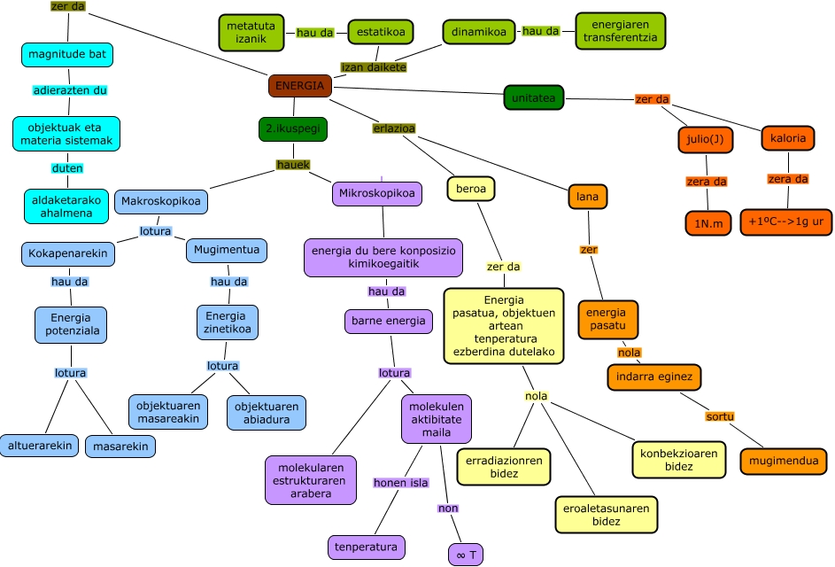 Este Cmap, tiene información relacionada con: Hezkuntza1, barne energia lotura molekularen estrukturaren arabera, Kokapenarekin hau da Energia potenziala, Mikroskopikoa energia du bere konposizio kimikoegaitik, Makroskopikoa lotura Mugimentua, unitatea zer da kaloria, 2.ikuspegi hauek Makroskopikoa, 2.ikuspegi hauek Mikroskopikoa, kaloria zera da +1ºC--ɭg ur, ENERGIA erlazioa beroa, Energia pasatua, objektuen artean tenperatura ezberdina dutelako nola erradiazionren bidez, ENERGIA unitatea unitatea, energia pasatu nola indarra eginez, molekulen aktibitate maila honen isla tenperatura, estatikoa hau da metatuta izanik, energia du bere konposizio kimikoegaitik hau da barne energia, Energia potenziala lotura altuerarekin, objektuak eta materia sistemak duten aldaketarako ahalmena, ENERGIA ???? 2.ikuspegi, Energia zinetikoa lotura objektuaren masareakin, Energia pasatua, objektuen artean tenperatura ezberdina dutelako nola eroaletasunaren bidez