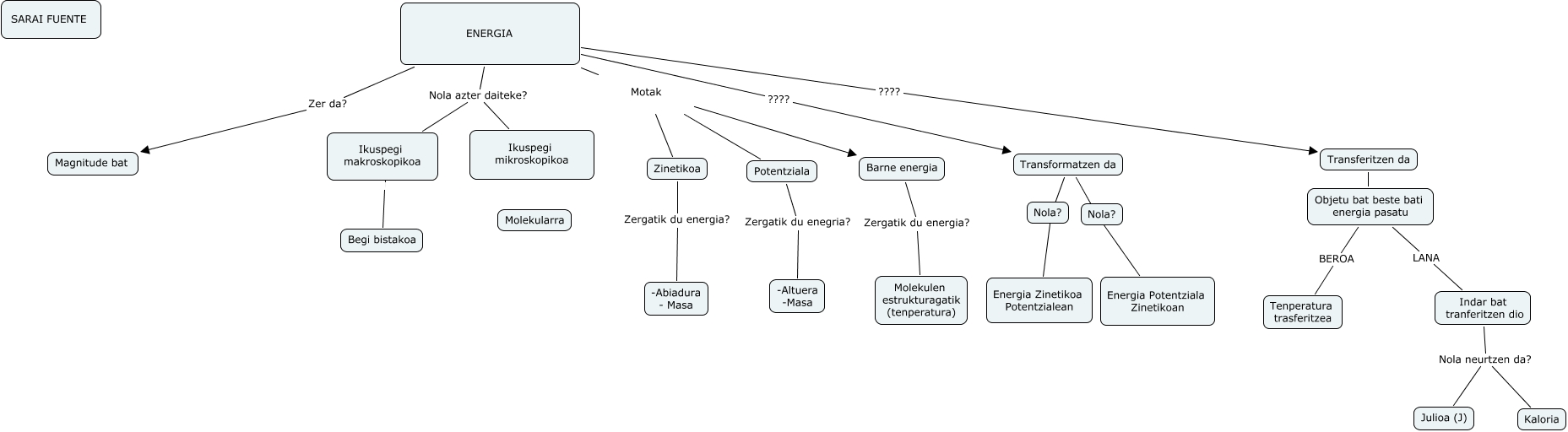 Este Cmap, tiene información relacionada con: Hezkuntza115, Indar bat tranferitzen dio Nola neurtzen da? Kaloria, Potentziala Zergatik du enegria? -Altuera -Masa, Zinetikoa Zergatik du energia? -Abiadura - Masa, Transformatzen da Energia Potentziala Zinetikoan, ENERGIA Motak Zinetikoa, Indar bat tranferitzen dio Nola neurtzen da? Julioa (J), ENERGIA Zer da? Magnitude bat, ENERGIA ???? Transformatzen da, Transferitzen da Objetu bat beste bati energia pasatu, ENERGIA Motak Potentziala, Objetu bat beste bati energia pasatu LANA Indar bat tranferitzen dio, Transformatzen da Energia Zinetikoa Potentzialean, ENERGIA Motak Barne energia, ENERGIA Nola azter daiteke? Ikuspegi mikroskopikoa, Ikuspegi makroskopikoa Begi bistakoa, Barne energia Zergatik du energia? Molekulen estrukturagatik (tenperatura), ENERGIA Nola azter daiteke? Ikuspegi makroskopikoa, Objetu bat beste bati energia pasatu BEROA Tenperatura trasferitzea, ENERGIA ???? Transferitzen da