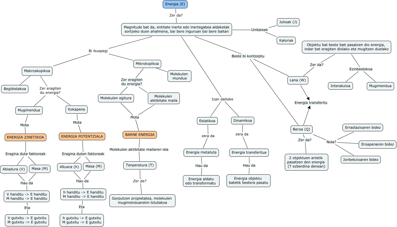Este Cmap, tiene información relacionada con: hezkuntza46, h handitu -> E handitu M handitu -> E handitu Eta h gutxitu -> E gutxitu M gutxitu -> E gutxitu, Magnitude bat da, entitate inerte edo inertegabea aldaketak sortzeko duen ahalmena, bai bere inguruan bai bere baitan Izan daiteke Estatikoa, Energia (E) Zer da? Magnitude bat da, entitate inerte edo inertegabea aldaketak sortzeko duen ahalmena, bai bere inguruan bai bere baitan, Dinamikoa zera da Energia transferitua, Beroa (Q) Nola? Eroapenaren bidez, Mikrokopikoa Molekulen mundua, Altuera (h) Hau da h handitu -> E handitu M handitu -> E handitu, Masa (M) Hau da h handitu -> E handitu M handitu -> E handitu, V handitu -> E handitu M handitu -> E handitu Eta V gutxitu -> E gutxitu M gutxitu -> E gutxitu, Magnitude bat da, entitate inerte edo inertegabea aldaketak sortzeko duen ahalmena, bai bere inguruan bai bere baitan Beste bi kontzeptu Beroa (Q), Magnitude bat da, entitate inerte edo inertegabea aldaketak sortzeko duen ahalmena, bai bere inguruan bai bere baitan Unitateak Julioak (J), Energia metatuta Hau da Energia aldatu edo transformatu, ENERGIA POTENTZIALA Eragina duten faktoreak Masa (M), Mugimendua Mota ENERGIA ZINETIKOA, Magnitude bat da, entitate inerte edo inertegabea aldaketak sortzeko duen ahalmena, bai bere inguruan bai bere baitan Izan daiteke Dinamikoa, Kokapena Mota ENERGIA POTENTZIALA, Makroskopikoa Zer eragiten du energia? Kokapena, Makroskopikoa Begibistakoa, Makroskopikoa Zer eragiten du energia? Mugimendua, Objektu bat beste bati pasatzen dio energia, indar bat eragiten diolako eta mugitzen duelako Ezinbestekoa Interakzioa