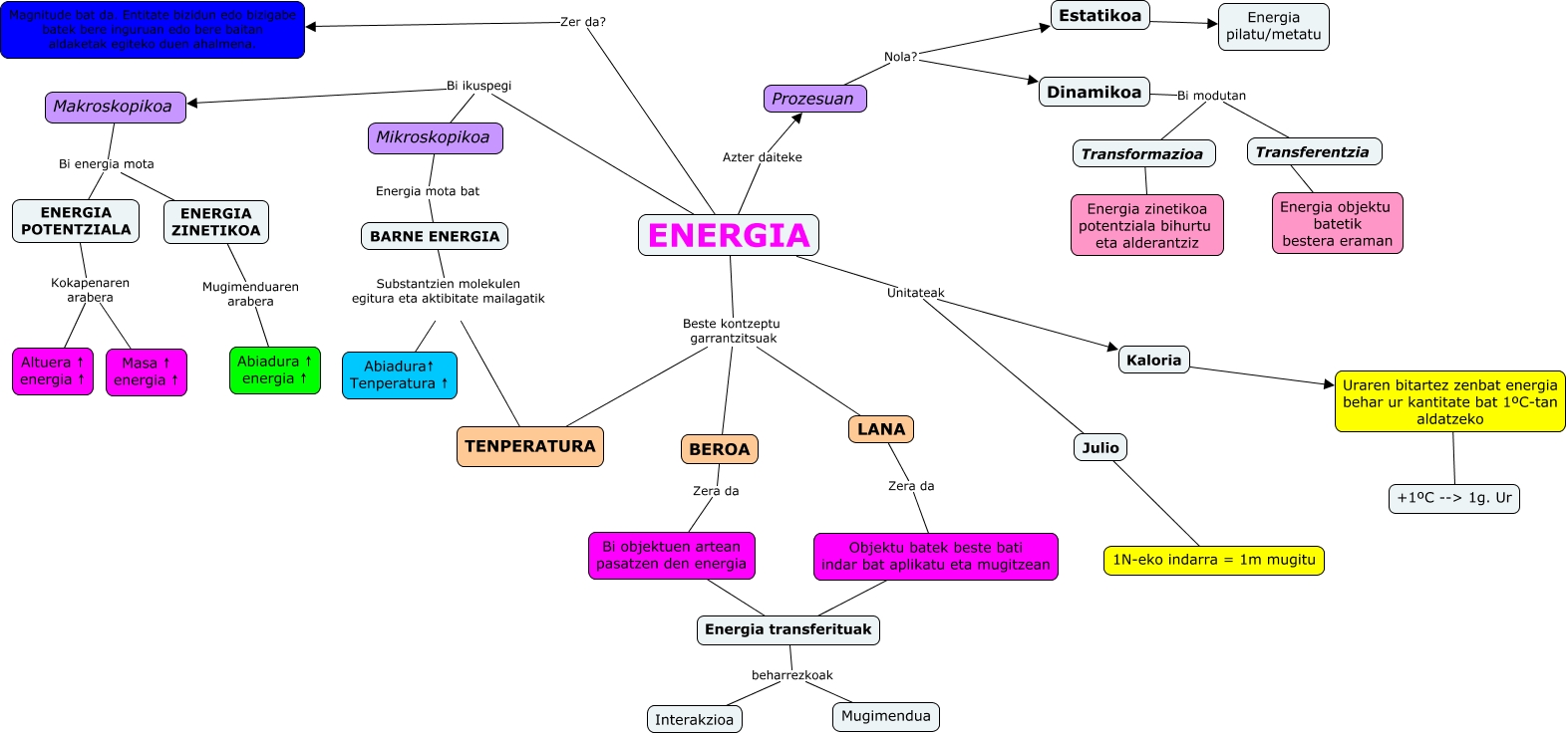 Este Cmap, tiene información relacionada con: hezkuntza 147, LANA Zera da Objektu batek beste bati indar bat aplikatu eta mugitzean, ENERGIA Beste kontzeptu garrantzitsuak TENPERATURA, Kaloria ???? Uraren bitartez zenbat energia behar ur kantitate bat 1ºC-tan aldatzeko, ENERGIA Unitateak Kaloria, Dinamikoa Bi modutan Transferentzia, ENERGIA ZINETIKOA Mugimenduaren arabera Abiadura ↑ energia ↑, ENERGIA POTENTZIALA Kokapenaren arabera Altuera ↑ energia ↑, Transformazioa ???? Energia zinetikoa potentziala bihurtu eta alderantziz, Transferentzia ???? Energia objektu batetik bestera eraman, Julio ???? 1N-eko indarra = 1m mugitu, Makroskopikoa Bi energia mota ENERGIA POTENTZIALA, ENERGIA Unitateak Julio, ENERGIA Bi ikuspegi Makroskopikoa, Uraren bitartez zenbat energia behar ur kantitate bat 1ºC-tan aldatzeko ???? +1ºC --> 1g. Ur, ENERGIA Bi ikuspegi Mikroskopikoa, ENERGIA Azter daiteke Prozesuan, Bi objektuen artean pasatzen den energia ???? Energia transferituak, Energia transferituak beharrezkoak Mugimendua, Makroskopikoa Bi energia mota ENERGIA ZINETIKOA, BARNE ENERGIA Substantzien molekulen egitura eta aktibitate mailagatik TENPERATURA