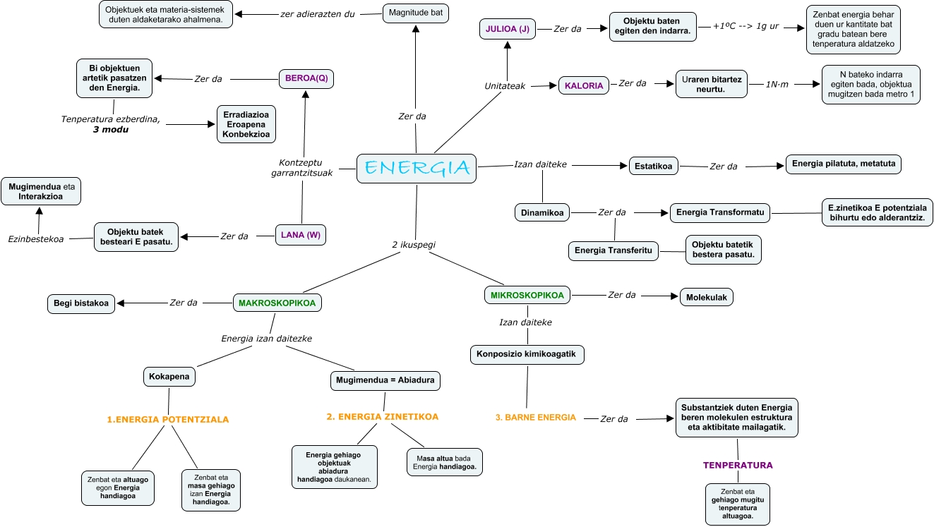 Este Cmap, tiene información relacionada con: hezkuntza7, Magnitude bat zer adierazten du Objektuek eta materia-sistemek duten aldaketarako ahalmena., ENERGIA Unitateak JULIOA (J), MIKROSKOPIKOA Zer da Molekulak, BEROA(Q) Zer da Bi objektuen artetik pasatzen den Energia., MAKROSKOPIKOA Energia izan daitezke Mugimendua = Abiadura, Kokapena 1.ENERGIA POTENTZIALA Zenbat eta masa gehiago izan Energia handiagoa., ENERGIA Zer da Magnitude bat, Energia Transformatu ???? E.zinetikoa E potentziala bihurtu edo alderantziz., Estatikoa Zer da Energia pilatuta, metatuta, Mugimendua = Abiadura 2. ENERGIA ZINETIKOA Energia gehiago objektuak abiadura handiagoa daukanean., 3. BARNE ENERGIA Zer da Substantziek duten Energia beren molekulen estruktura eta aktibitate mailagatik., ENERGIA Izan daiteke Estatikoa, Dinamikoa Zer da Energia Transformatu, Konposizio kimikoagatik ???? 3. BARNE ENERGIA, Energia Transferitu ???? Objektu batetik bestera pasatu., KALORIA Zer da Uraren bitartez neurtu., Mugimendua = Abiadura 2. ENERGIA ZINETIKOA Masa altua bada Energia handiagoa., Kokapena 1.ENERGIA POTENTZIALA Zenbat eta altuago egon Energia handiagoa, Dinamikoa Zer da Energia Transferitu, ENERGIA 2 ikuspegi MAKROSKOPIKOA