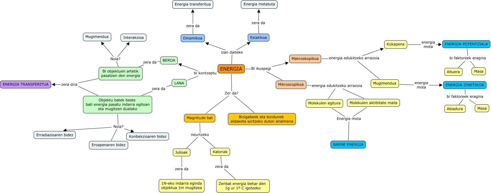 Este Cmap, tiene información relacionada con: hezkuntza43, LANA zera da Objektu batek beste bati energia pasatu indarra egitean eta mugitzen duelako, ENERGIA Bi ikuspegi Makroskopikoa, ENERGIA izan daiteke Estatikoa, ENERGIA ZINETIKOA bi faktoreek eragina Abiadura, Bi objektuen artetik pasatzen den energia Nola? Interakzioa, ENERGIA ZINETIKOA bi faktoreek eragina Masa, Makroskopikoa energia edukitzeko arrazoia Kokapena, ENERGIA bi kontzeptu BEROA, ENERGIA bi kontzeptu LANA, ENERGIA POTENTZIALA bi faktoreek eragina Masa, ENERGIA izan daiteke Dinamikoa, Kokapena energia mota ENERGIA POTENTZIALA, Objektu batek beste bati energia pasatu indarra egitean eta mugitzen duelako Nola? Eroapenaren bidez, Bi objektuen artetik pasatzen den energia Nola? Mugimendua, Estatikoa zera da Energia metatuta, Molekulen egitura Energia mota BARNE ENERGIA, BEROA zera da Bi objektuen artetik pasatzen den energia, ENERGIA Bi ikuspegi Mikroscopikoa, ENERGIA POTENTZIALA bi faktoreek eragina Altuera, Magnitude bat neurtzeko Kaloriak