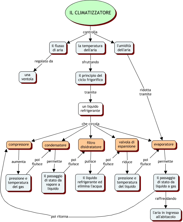 Questa Cmap, creata con IHMC CmapTools, contiene informazioni relative a: Climatizzatore, l'umidità dell'aria ridotta tramite evaporatore, compressore aumenta pressione e temperatura del gas, evaporatore permette il passaggio di stato da liquido a gas, valvola di espansione riduce pressione e temperatura del liquido, il passaggio di stato da liquido a gas raffreddando l'aria in ingresso all'abitacolo, il passaggio di stato da vapore a liquido poi fluisce filtro disidratatore, filtro disidratatore pulisce il liquido refrigerante ed elimina l'acqua, il liquido refrigerante ed elimina l'acqua poi fluisce valvola di espansione, un liquido refrigerante che circola filtro disidratatore, un liquido refrigerante che circola evaporatore, la temperatura dell'aria sfruttando il principio del ciclo frigorifico, IL CLIMATIZZATORE controlla il flusso di aria, IL CLIMATIZZATORE controlla la temperatura dell'aria, un liquido refrigerante che circola condensatore, pressione e temperatura del gas poi fluisce condensatore, condensatore permette il passaggio di stato da vapore a liquido, un liquido refrigerante che circola compressore, il passaggio di stato da liquido a gas poi ritorna compressore, pressione e temperatura del liquido poi fluisce evaporatore, un liquido refrigerante che circola valvola di espansione