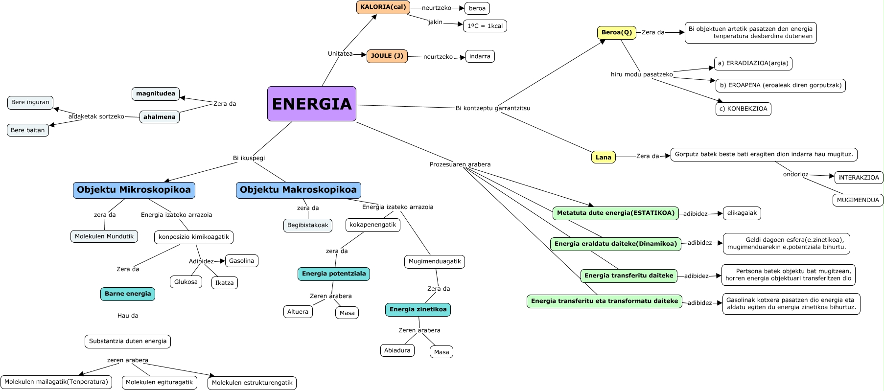 Este Cmap, tiene información relacionada con: Hezkuntza3, Objektu Mikroskopikoa zera da Molekulen Mundutik, Energia potentziala Zeren arabera Masa, Objektu Makroskopikoa zera da Begibistakoak, Beroa(Q) hiru modu pasatzeko a) ERRADIAZIOA(argia), Gorputz batek beste bati eragiten dion indarra hau mugituz. ondorioz iNTERAKZIOA, konposizio kimikoagatik Adibidez Gasolina, JOULE (J) neurtzeko indarra, Gorputz batek beste bati eragiten dion indarra hau mugituz. ondorioz MUGIMENDUA, Lana Zera da Gorputz batek beste bati eragiten dion indarra hau mugituz., Substantzia duten energia zeren arabera Molekulen mailagatik(Tenperatura), ENERGIA Zera da magnitudea, ENERGIA Bi ikuspegi Objektu Mikroskopikoa, konposizio kimikoagatik Adibidez Ikatza, ahalmena aldaketak sortzeko Bere baitan, Barne energia Hau da Substantzia duten energia, ENERGIA Bi ikuspegi Objektu Makroskopikoa, konposizio kimikoagatik Adibidez Glukosa, ENERGIA Prozesuaren arabera Energia eraldatu daiteke(Dinamikoa), ENERGIA Prozesuaren arabera Energia transferitu daiteke, ENERGIA Bi kontzeptu garrantzitsu Beroa(Q)