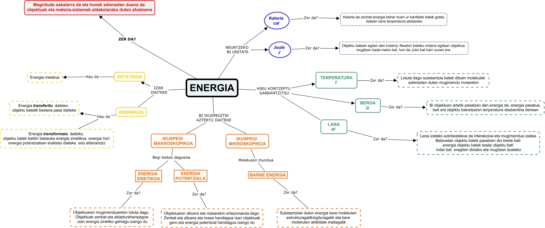 Este Cmap, tiene información relacionada con: Hezkuntza_123, ENERGIA ZER DA? Magnitude eskalarra da eta honek adierazten duena da objektuek eta materia-sistemek aldaketarako duten ahalmena, ENERGIA HIRU KONTZEPTU GARRANTZITSU TENPERATURA T, ENERGIA NEURTZEKO BI UNITATE Joule J, ENERGIA HIRU KONTZEPTU GARRANTZITSU LANA W, ENERGIA BI IKUSPEGITIK AZTERTU DAITEKE IKUSPEGI MAKROSKOPIKOA, ENERGIA IZAN DAITEKE ESTATIKOA, DINAMIKOA Hau da Energia transferitu daiteke, objektu batetik bestera pasa daiteke, ENERGIA ZINETIKOA Zer da? Objektuaren mugimenduarekin lotuta dago. Objektuak zenbat eta abiadurahansiagoa izan energia zinetiko gehiago izango du, Kaloria cal Zer da? Kaloria da zenbat energia behar duen ur kantitate batek gradu batean bere tenperatura aldatzeko, BEROA Q Zer da? Bi objektuen artetik pasatzen den energia da, energia pasatua, beti ere objektu bakoitzaren tenperatura desberdina denean, ENERGIA HIRU KONTZEPTU GARRANTZITSU BEROA Q, TENPERATURA T Zer da? Lotuta dago substantzia batek dituen molekulek adierazten duten mugimendu motarekin, DINAMIKOA Hau da Energia transformatu daiteke, objektu batek baldin badauka energia zinetikoa, energia hori energia potentzialean eraldatu daiteke, edo alderantziz, IKUSPEGI MAKROSKOPIKOA Begi bistan dagoena ENERGIA POTENTZIALA, LANA W Zer da? Lana izateko ezinbestekoa da interakzioa eta mugimendua izatea. Batzuetan objektu batek pasatzen dio beste bati energia objektu batek beste objektu bati indar bat eragiten diolako eta mugitzen duelako, ENERGIA NEURTZEKO BI UNITATE Kaloria cal, IKUSPEGI MAKROSKOPIKOA Begi bistan dagoena ENERGIA ZINETIKOA, Joule J Zer da? Objektu batean egiten den indarra; Newton bateko indarra egitean objektua mugitzen bada metro bat, hori da Julio bat hain zuzen ere., BARNE ENERGIA Zer da? Substantziek duten energia bere molekulen estrukturagatik/egituragatik eta bere molekulen aktibitate mailagatik, ENERGIA BI IKUSPEGITIK AZTERTU DAITEKE IKUSPEGI MIKROSKOPIKOA